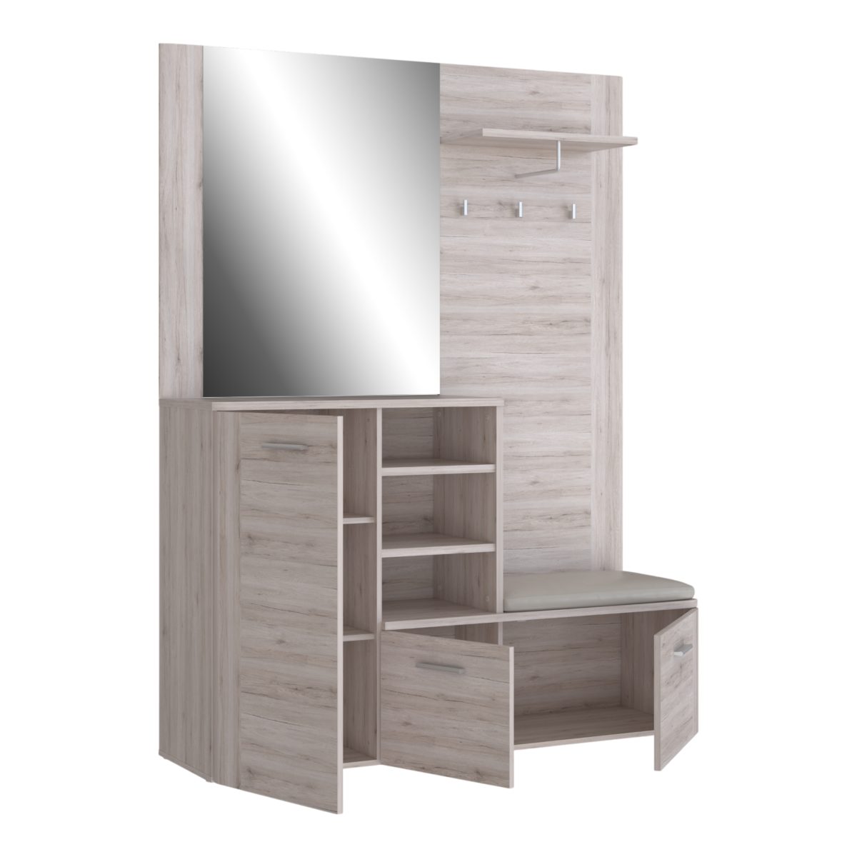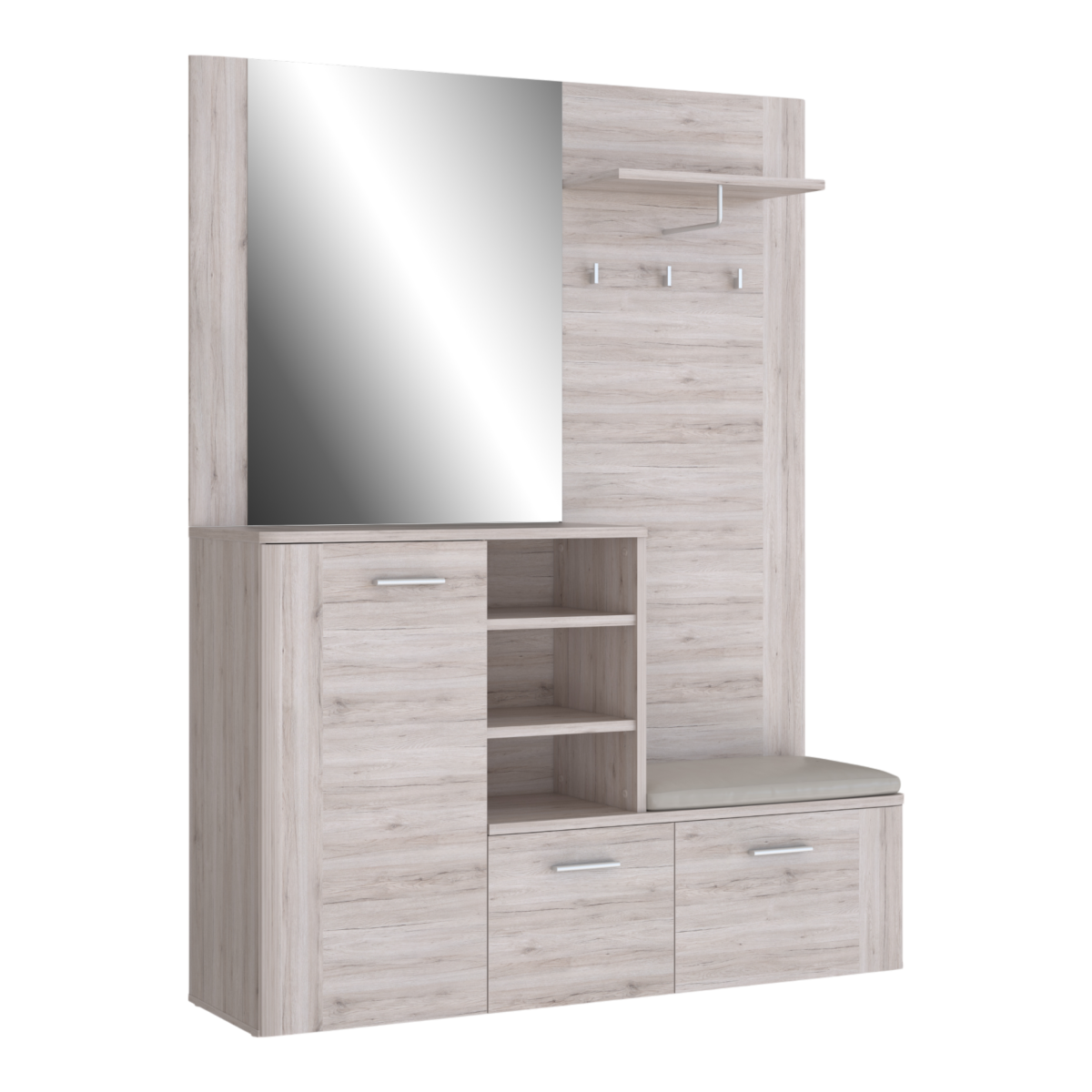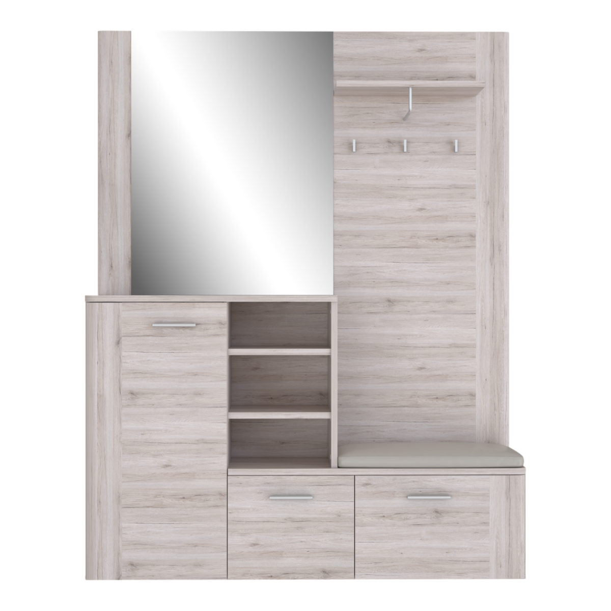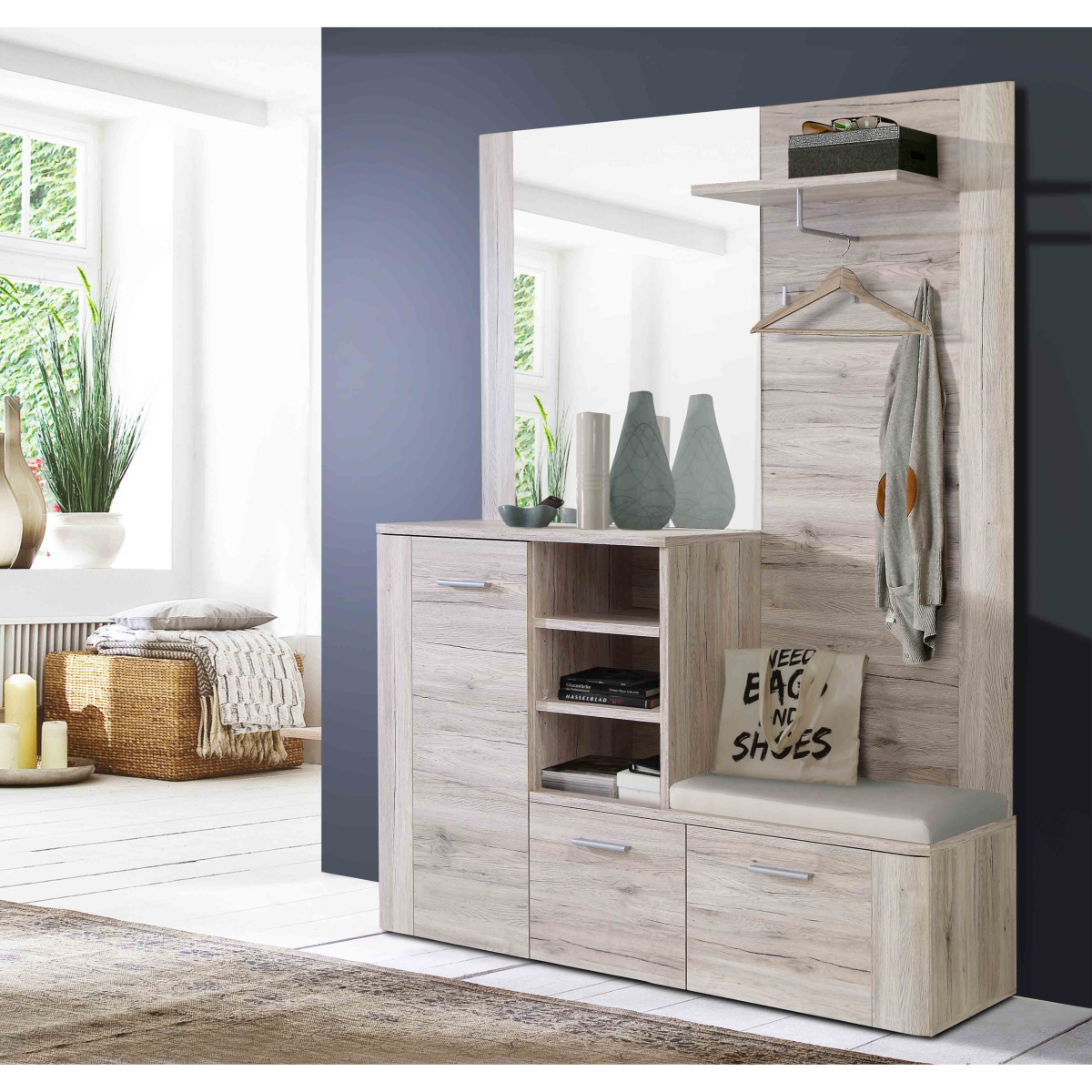 A homok tölgy színű előszobabútor természetes faerezetű dekorjával melegséget és eleganciát visz a belső térbe. Kompakt kialakításának köszönhetően minden fontos funkciót egyetlen egységbe sűrít: fogaspanellel, ülőkével, zárt és nyitott tárolórekeszekkel, valamint egy nagyméretű tükörrel segíti az előszobád rendezettségét és kényelmét.