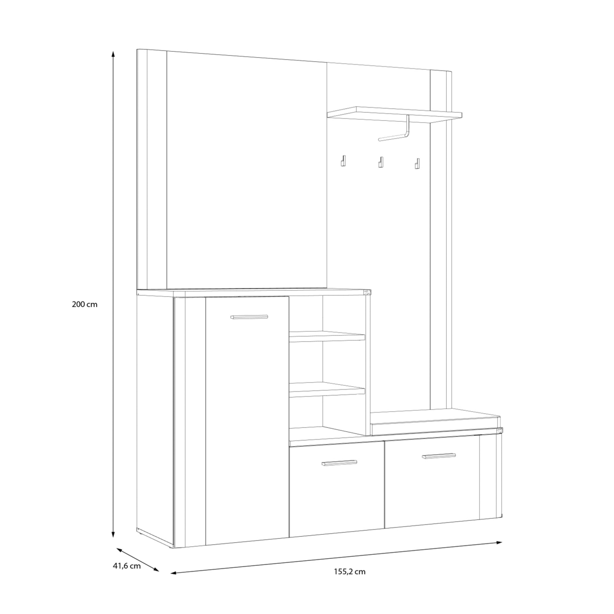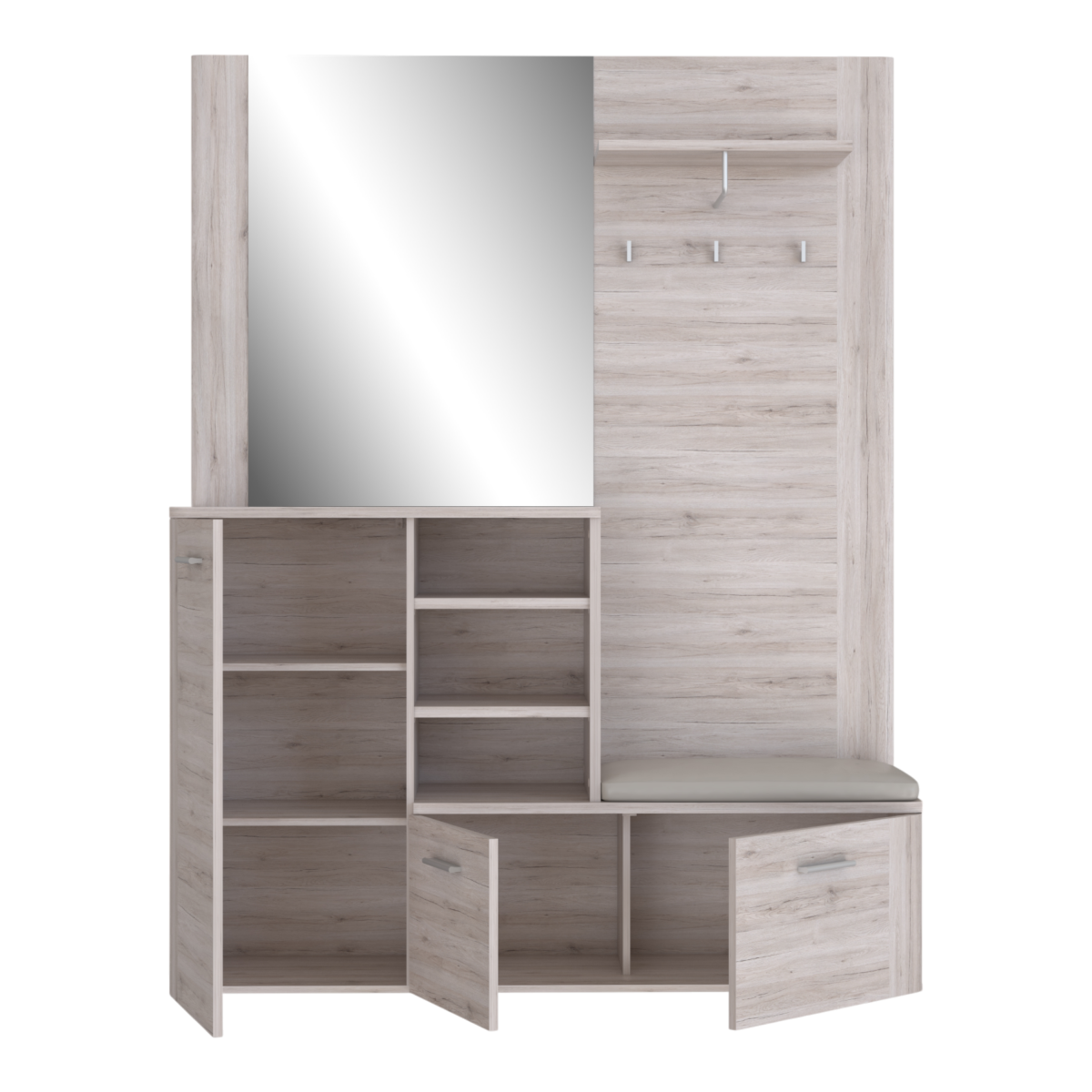 A három akasztóval és felső polccal ellátott fogaspanel ideális a kabátok, táskák gyors elhelyezésére. Az ülőfelület puha, bézs szövetborítással kényelmes cipőfelvételt biztosít. A három zárt szekrény mögött öt tárolórekesz található, így rendszerezetten tarthatod a cipőidet és kiegészítőidet, míg a nyitott polcokon mindig kéznél lesznek a legfontosabb dolgaid. A 99x76 cm-es tükör vizuálisan tágítja a teret, és praktikus segítséget nyújt indulás előtt.