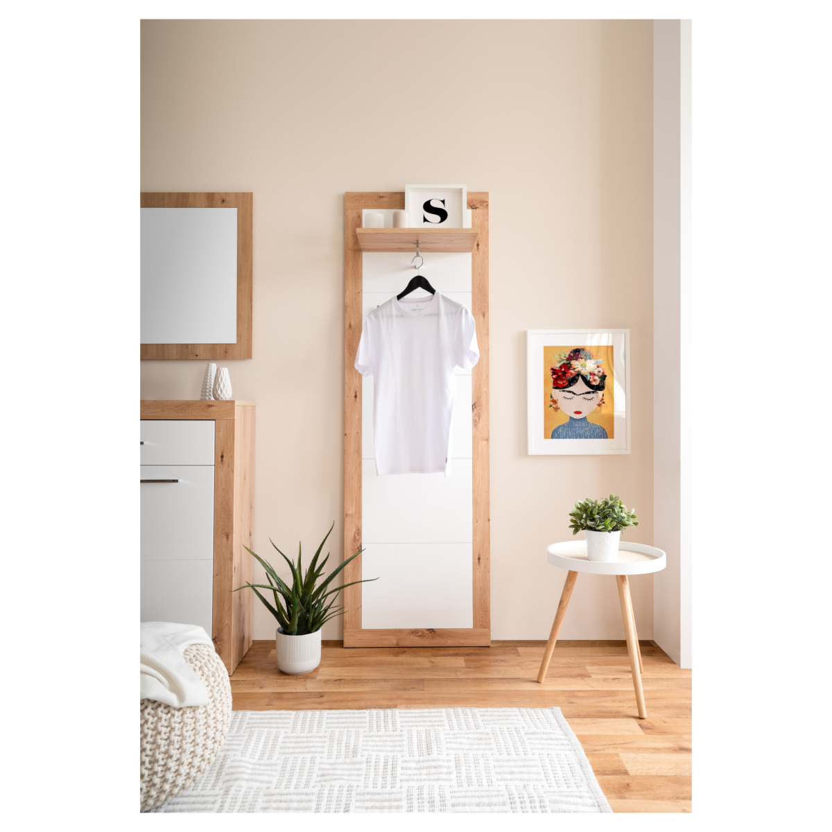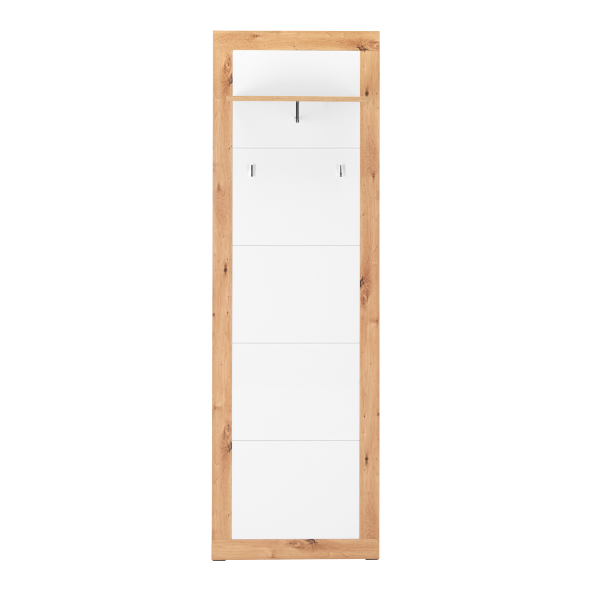 A Wien 43 fali panel elegáns és funkcionális megoldás az előszobai tároláshoz. Artisan tölgy és fehér színkombinációja modern, mégis természetes megjelenést kölcsönöz, így jól illeszkedik különböző stílusú enteriőrökbe. A 60×190×35 cm-es méret ideális kis és közepes előszobákba, ahol fontos a helytakarékosság és az átlátható rendszerezés.
