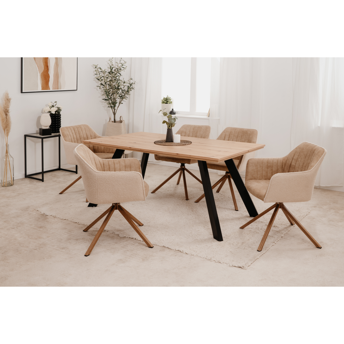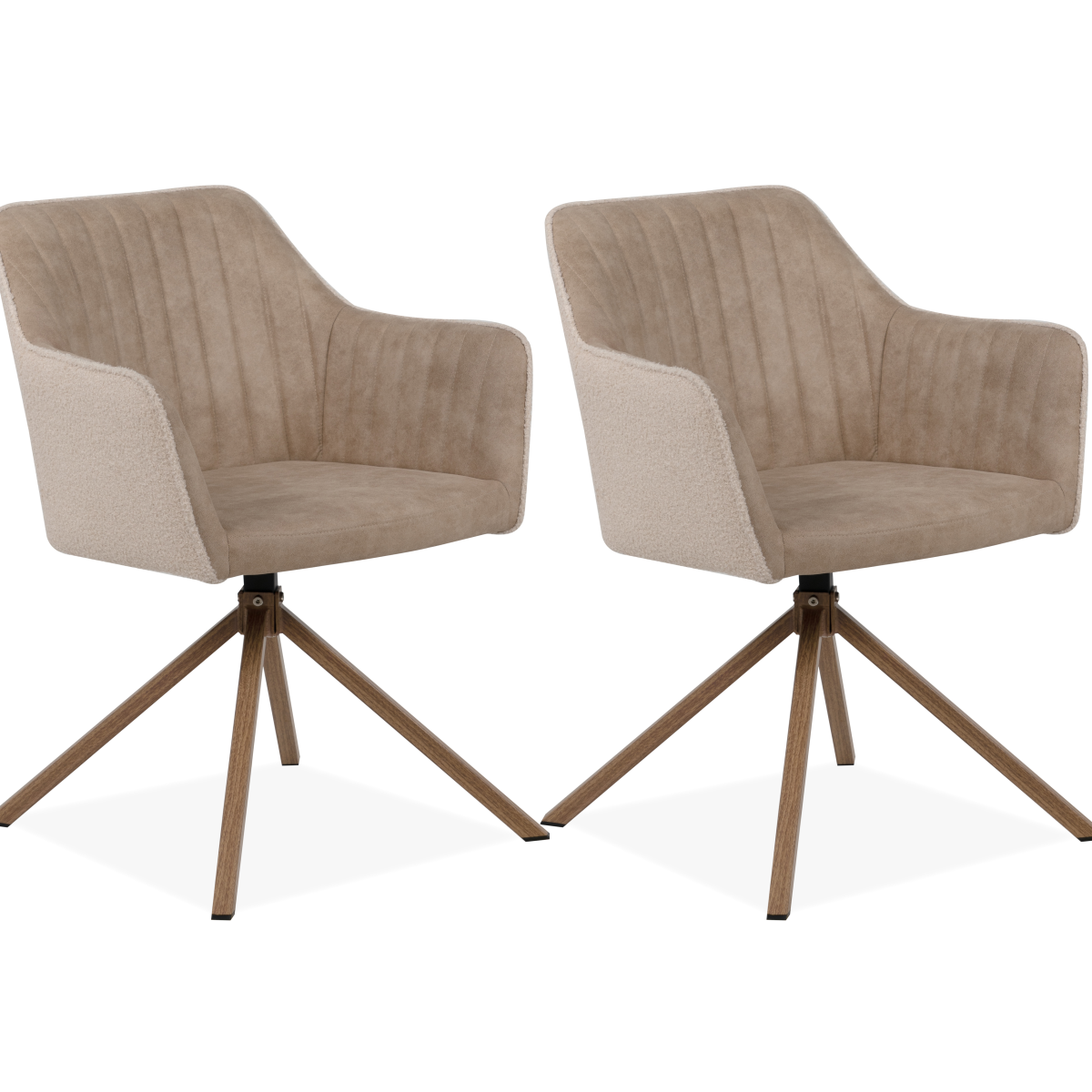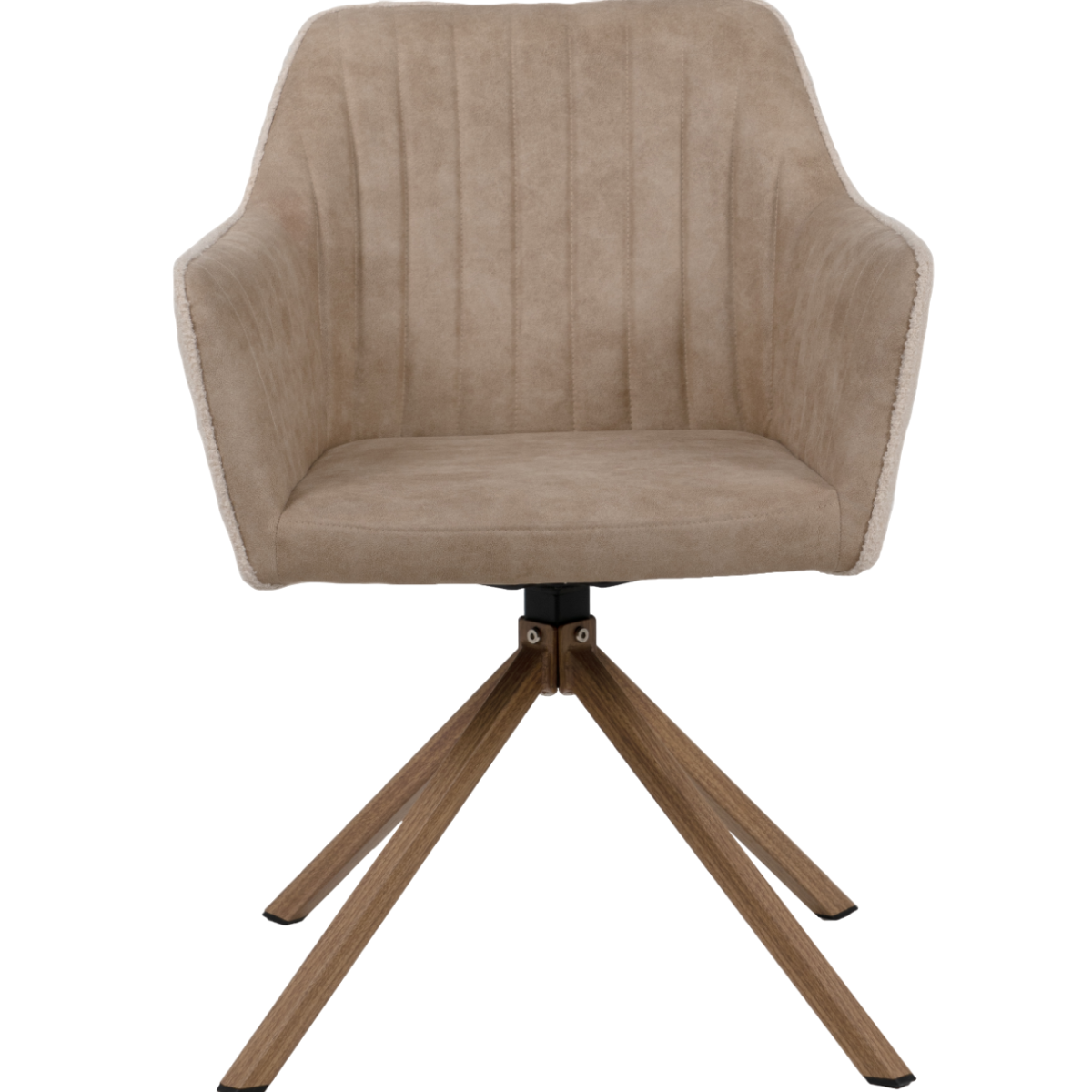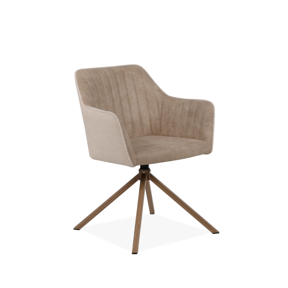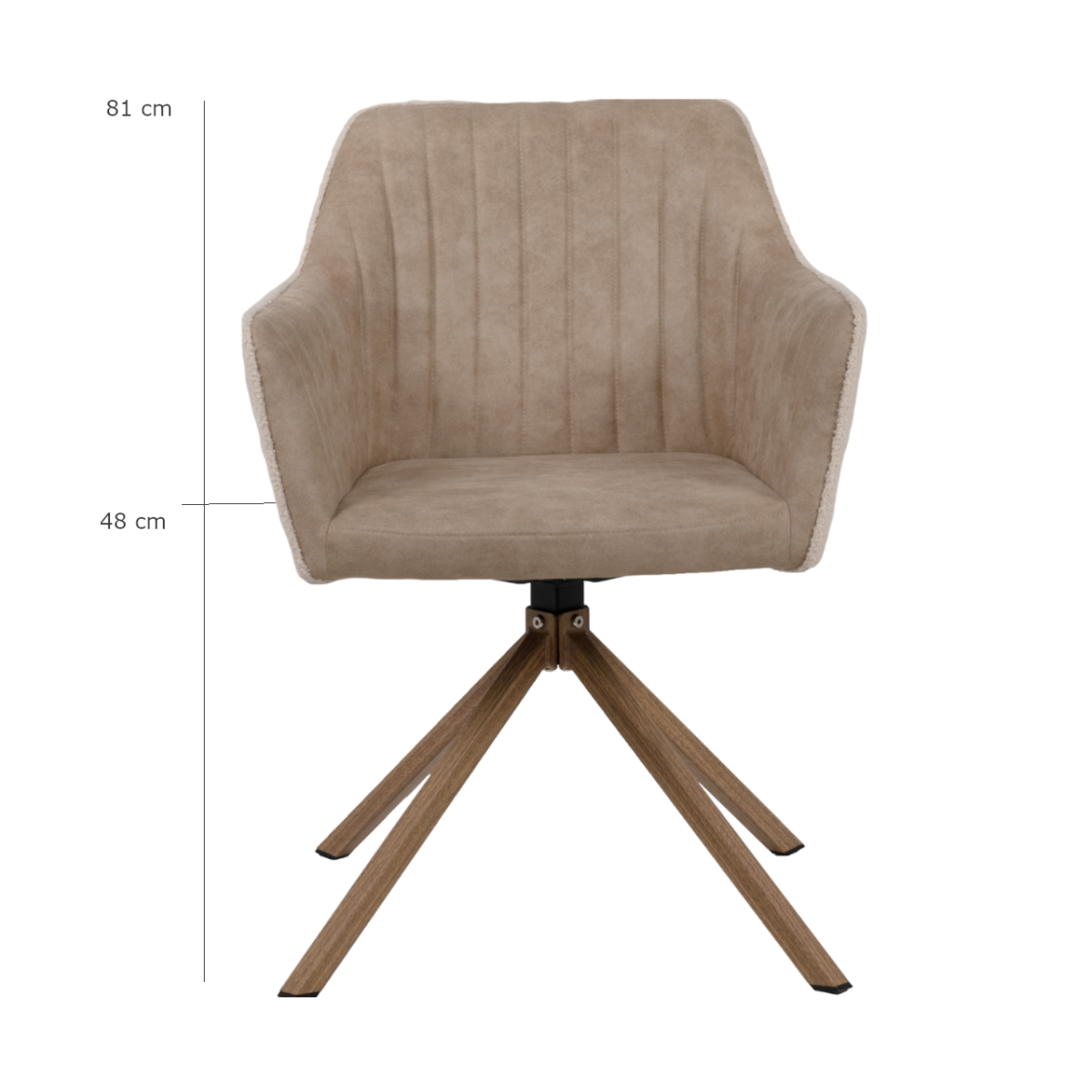Elegáns megjelenésű komfortos karosszék stílust visz az étkezőbe. Fém vázzal, bézs színű szövet ülő- és hátrésszel készült. A hátrészt varrott csíkok sorozata díszíti, mely feltűnő mintát formáz. Az ülőfelület kényelmes, párnázott, forgatható. Ülésmagasság: 45 cm.