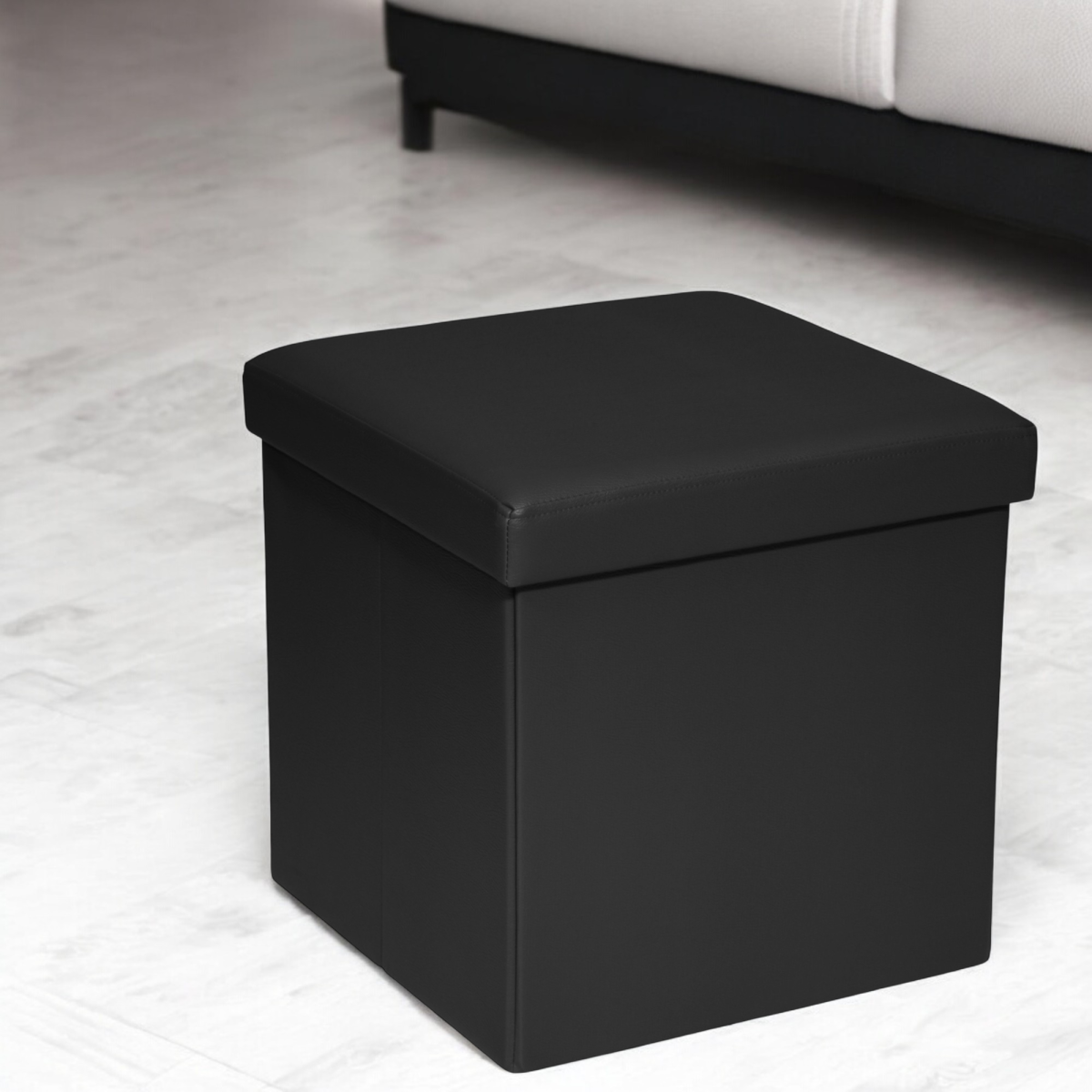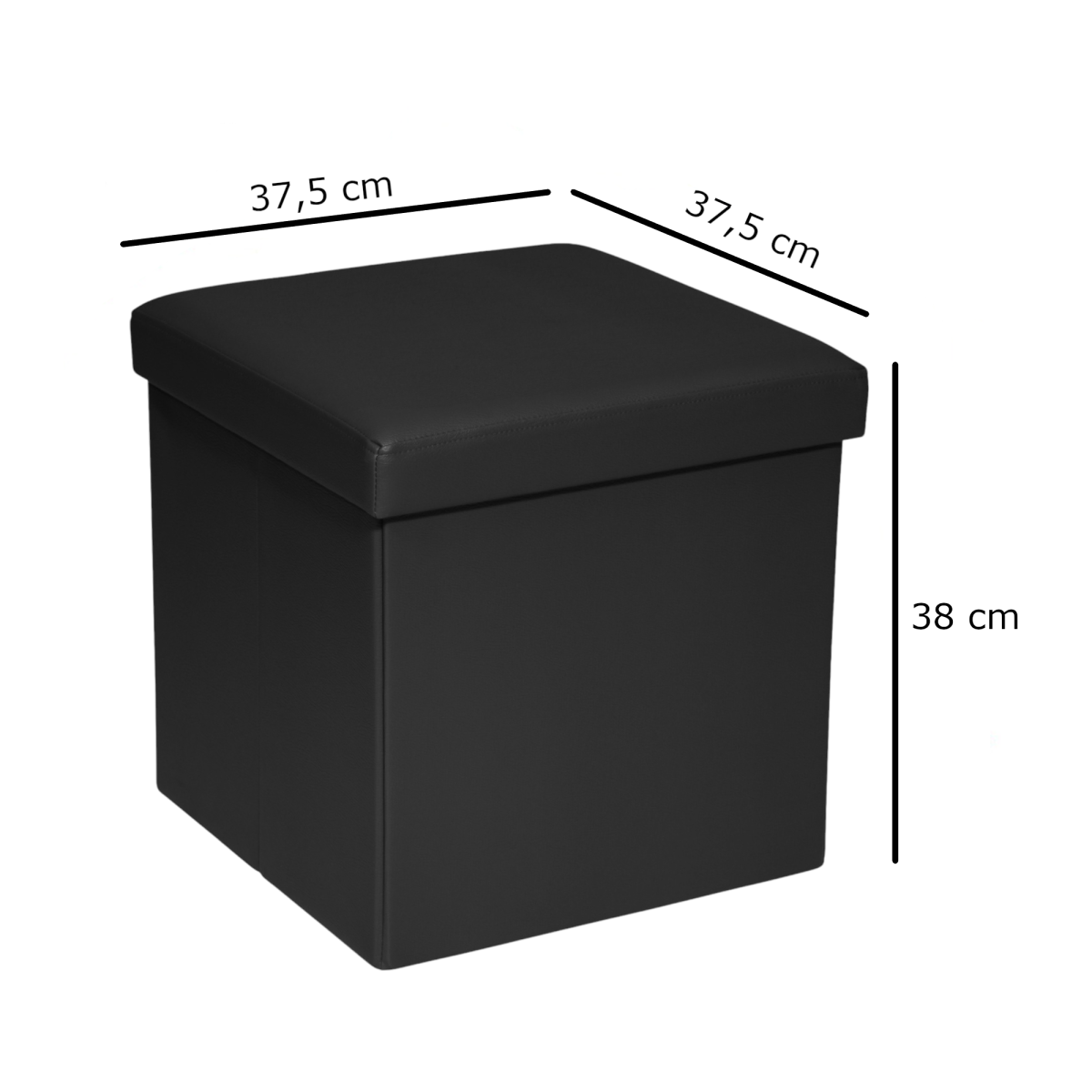 Összehajtható tárolós ülőke, fekete színben, 37,5x37,5x38 cm méretben.