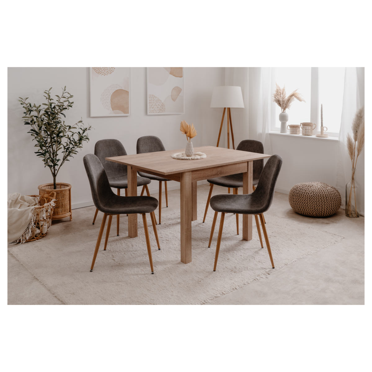 Az Anya 70 A étkezőszék stílusos kiegészítője lehet modern vagy klasszikus berendezésű étkezőknek. A sötétszürke bársonyhuzat puha tapintású és kényelmes ülést biztosít, míg a fa hatású, enyhén döntött lábak stabil alátámasztást nyújtanak. Az ergonomikus háttámla kényelmet kínál akár hosszabb étkezések vagy beszélgetések során is.