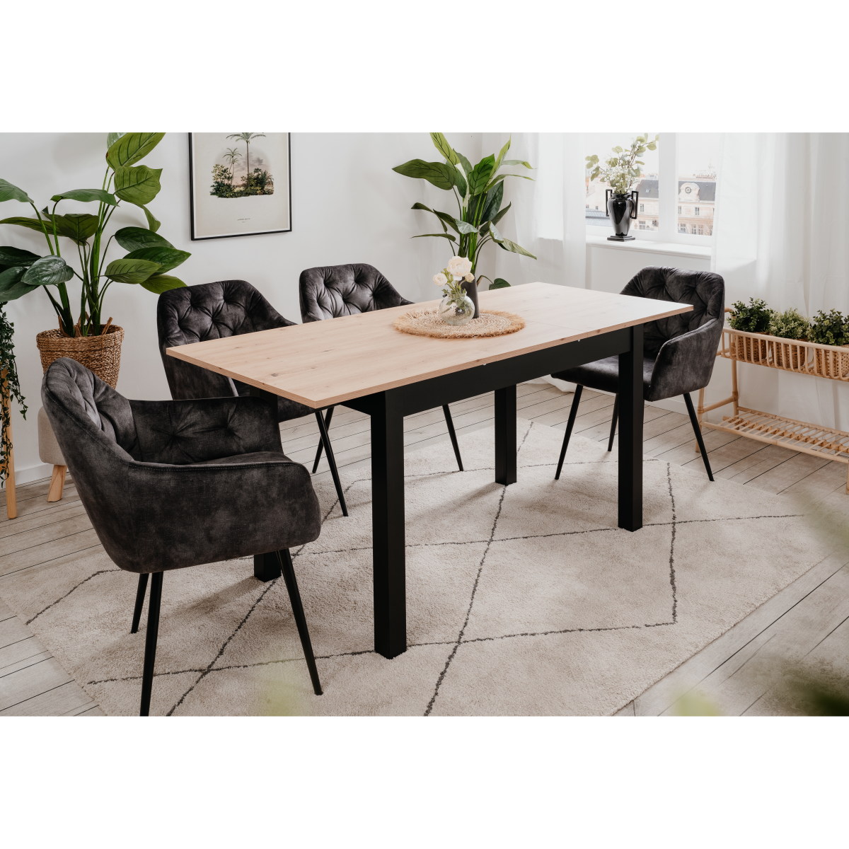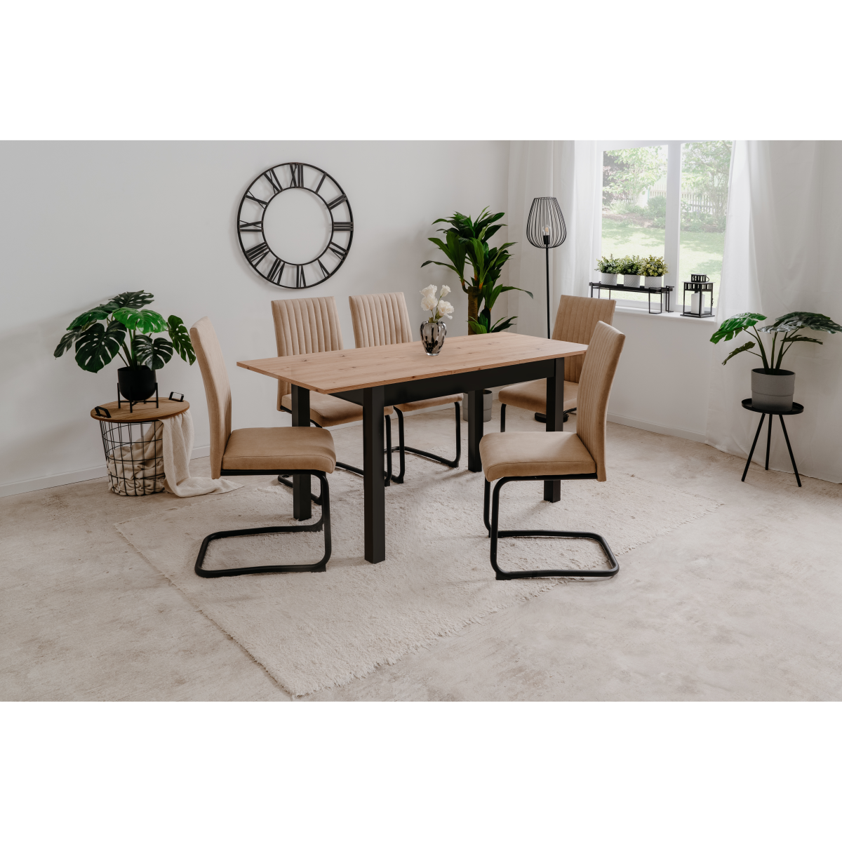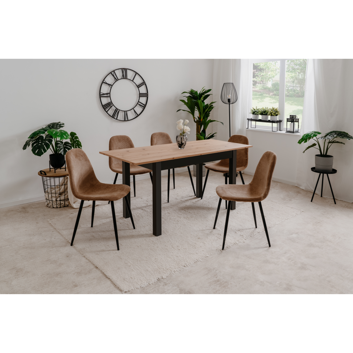 A Coburg 120 kihúzható étkezőasztal Artisan tölgy-fekete színben, kétféle modellben praktikus megoldást kínál kisebb alapterületű étkezőkbe és konyhákba. Alapállapotban kompakt méretű, szükség esetén azonban könnyedén bővíthető, így több vendég is kényelmesen elfér körülötte. Letisztult formavilága és semleges színvilága jól illeszkedik modern enteriőrökbe.