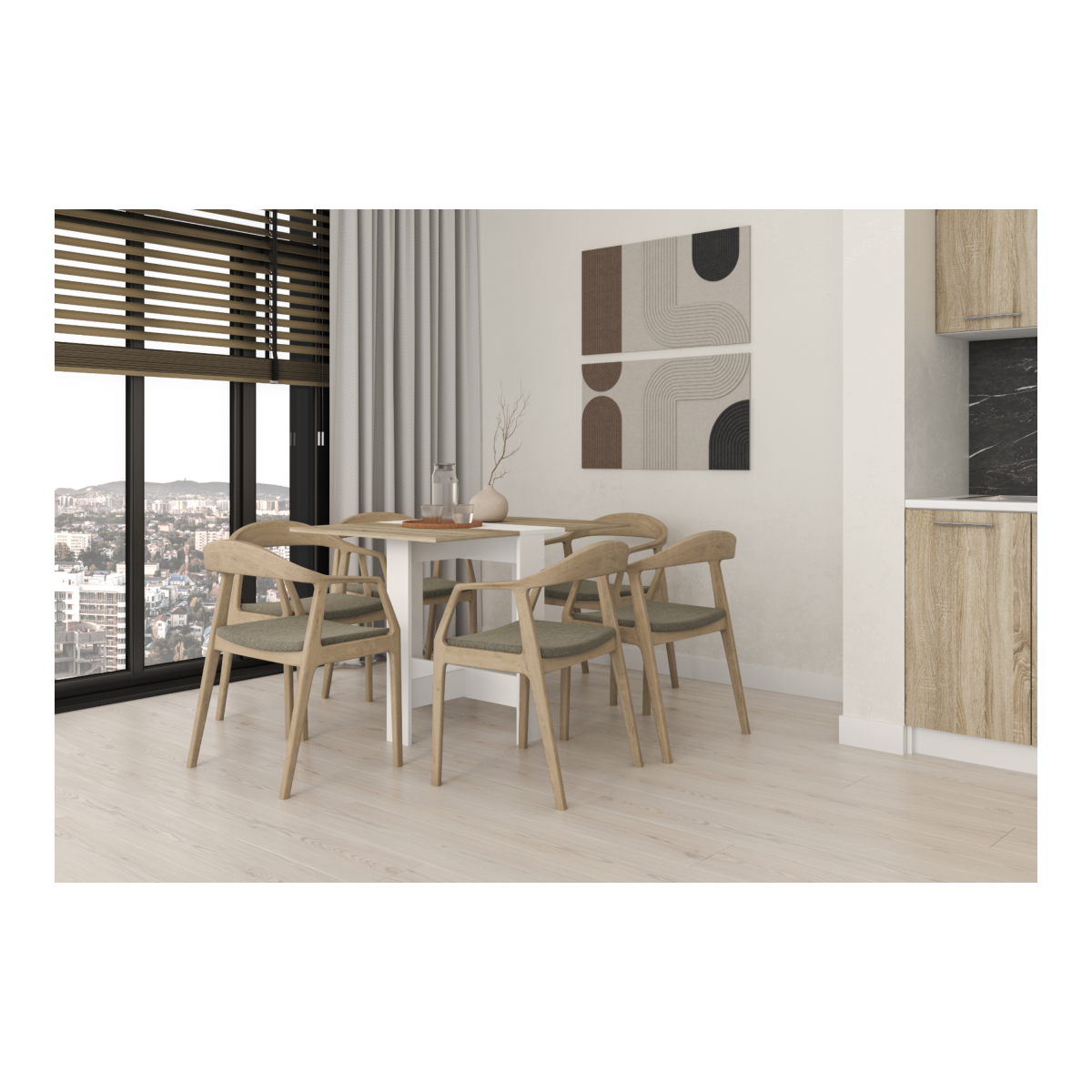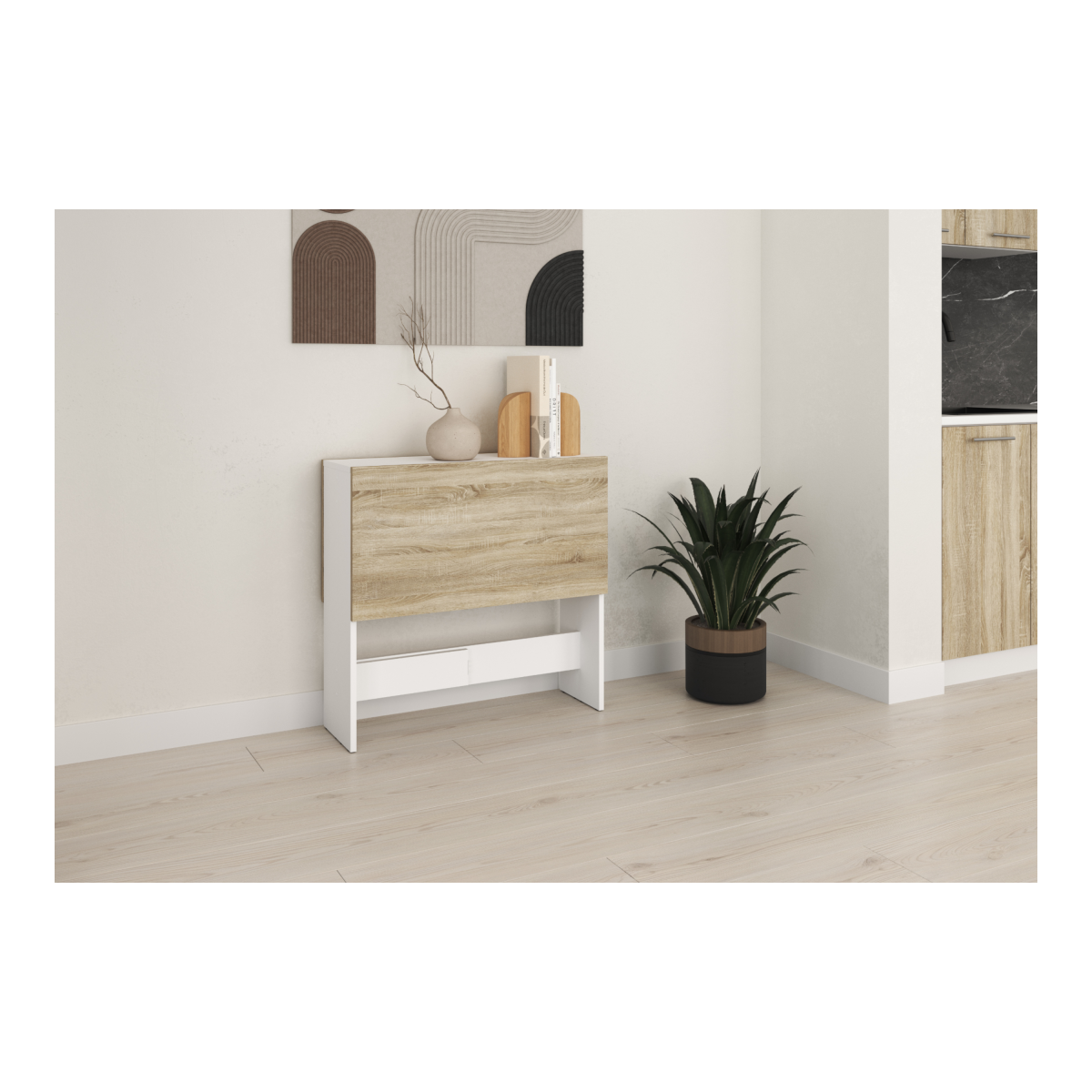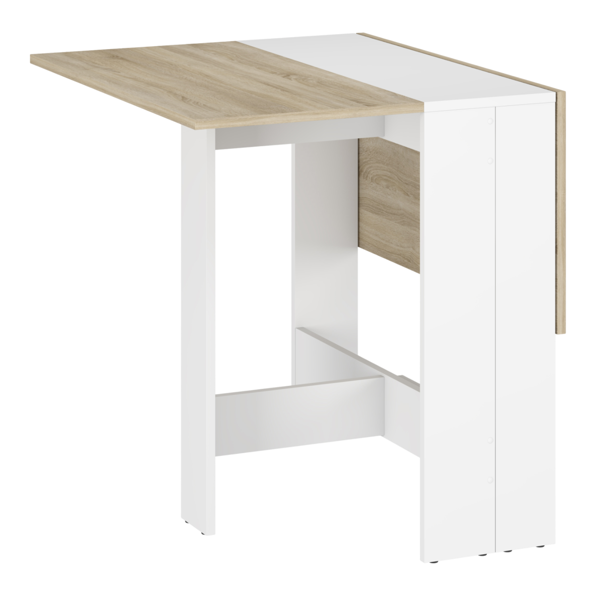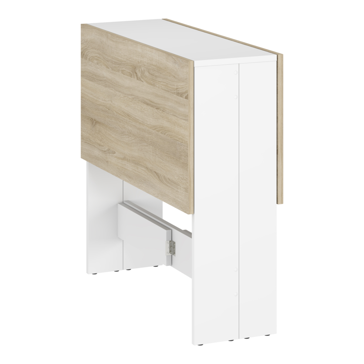 Az Edgar kinyitható étkezőasztal praktikus és stílusos választás, ha kis térben is szeretnéd kényelmesen megoldani az étkezéseket. Letisztult fehér és természetes sonoma tölgy színkombinációja világos, barátságos hangulatot teremt, miközben a bútor egyszerre funkcionális és esztétikus. Összecsukott állapotban rendkívül kompakt, így ideális kisebb lakásokba, garzonokba vagy akár dolgozószobába is, ahol időnként plusz asztalfelületre van szükség.
