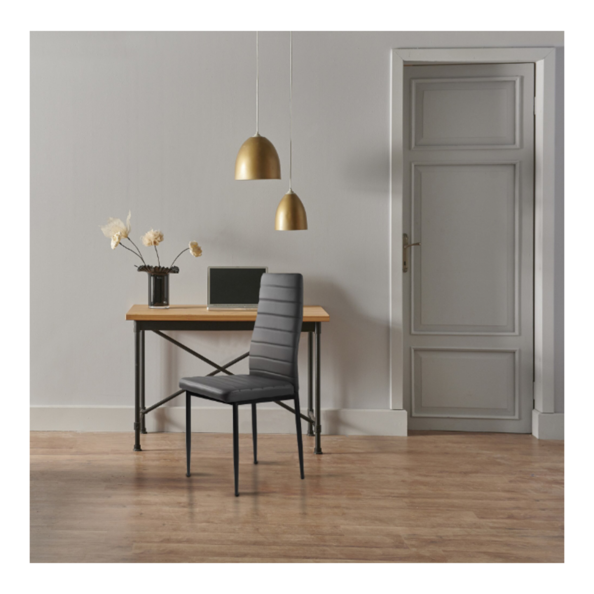 A Line étkezőszék modern, letisztult megjelenésével könnyen illeszkedik különböző lakberendezési stílusokhoz. A szürke kárpitozott ülőfelület és háttámla visszafogott, elegáns hatást kelt, míg a fekete lábak kontrasztos, modern megjelenést adnak a széknek.