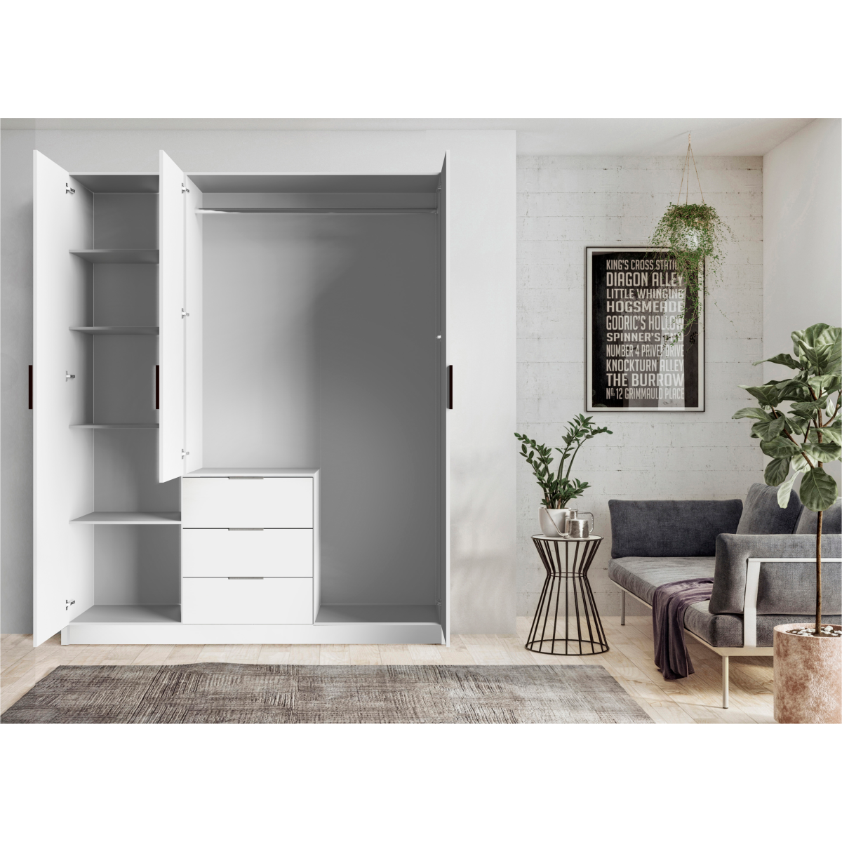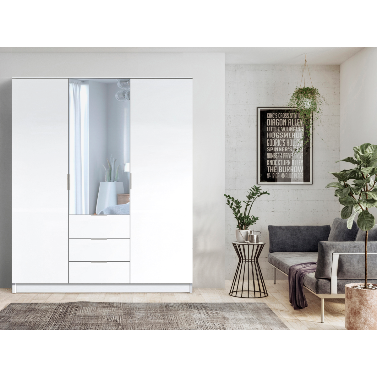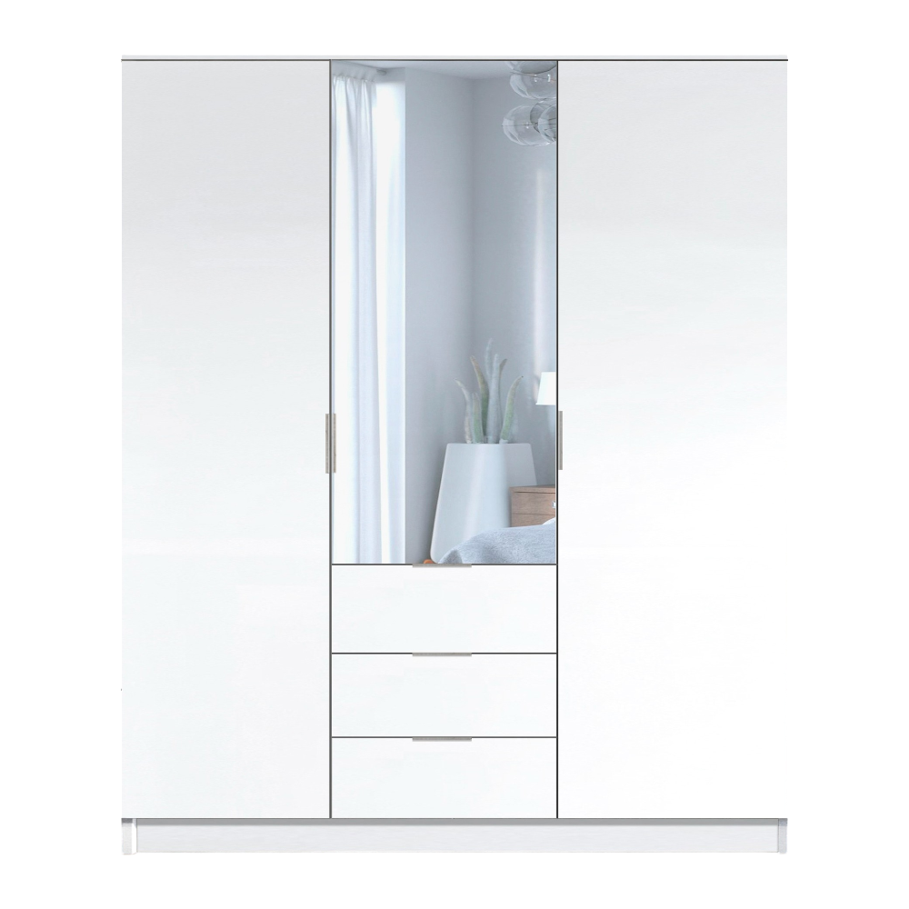 Lambda gardróbszekrény tükrös ajtóval, fehér színben. A szekrény belső elrendezése: 3 ajtó, 3 fiók, tükör és 4 polc.