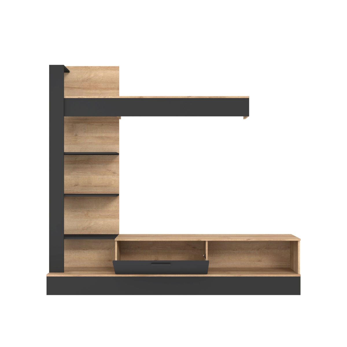 Egyedi loft stílusú GELUZA nappali fal. Tartalmaz egy magas könyvespolcot, egy polcot és egy TV szekrényt, amelyeken elhelyezheti és tárolhatja tárgyait. A fekete és a meleg tölgy dekor kombinációja erőteljes hangsúlyt kölcsönöz a belső térnek. A termék színe: riviera tölgy, fekete. A fekete lábak és fogantyúk kiemelik a bútor loft stílusát. Falra szerelés szükséges (segédanyag tartozék).