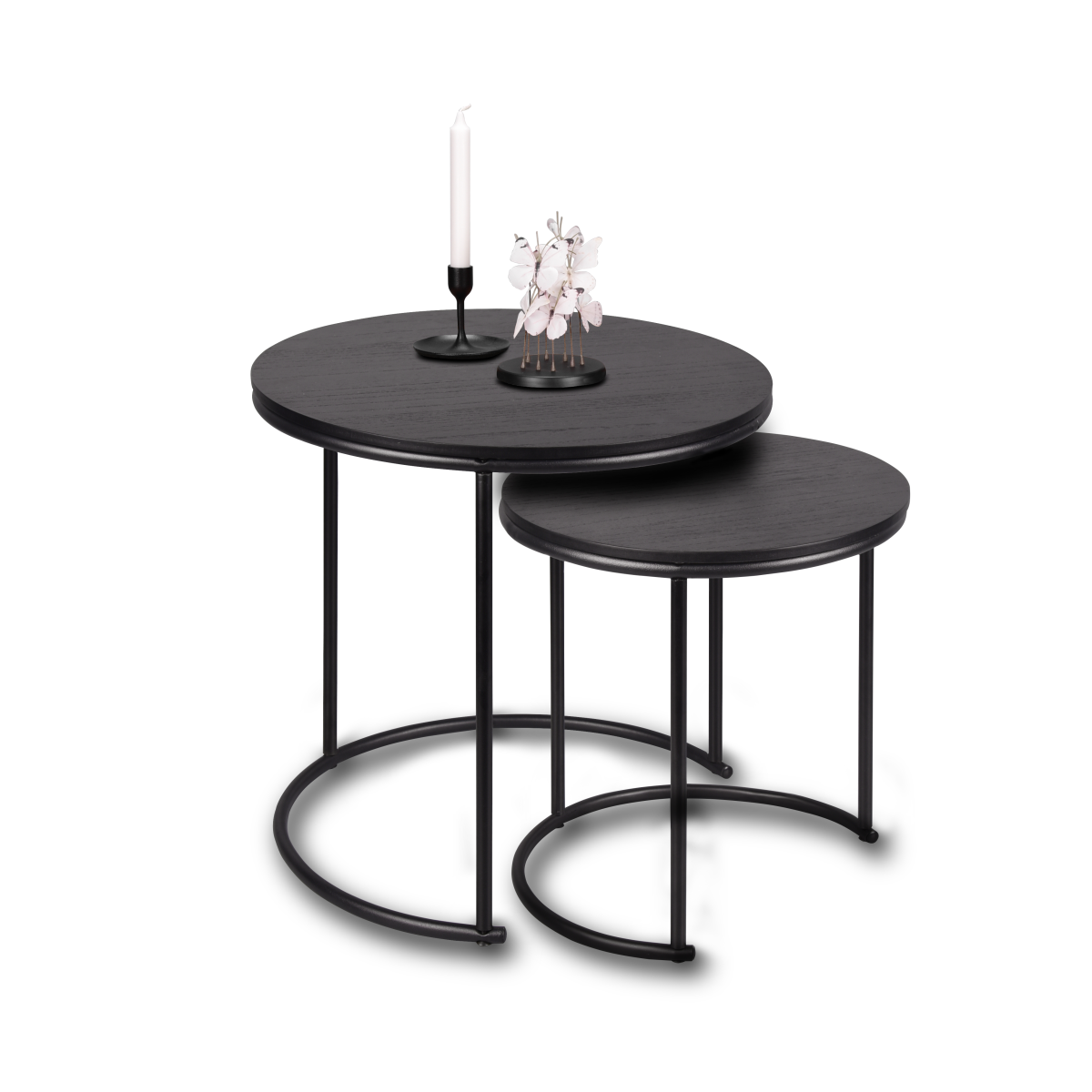 A PAULA kisasztal praktikus berendezési tárgya a modern nappaliknak, balkonoknak. időtálló dizájn, letisztult forma és elegáns megjelenés jellemzi a terméket. Az egyszerű kialakítású egymásba tolható kis asztalok. Az asztalok kerete fekete fém. Az asztalok lapja MDF és fekete színű..