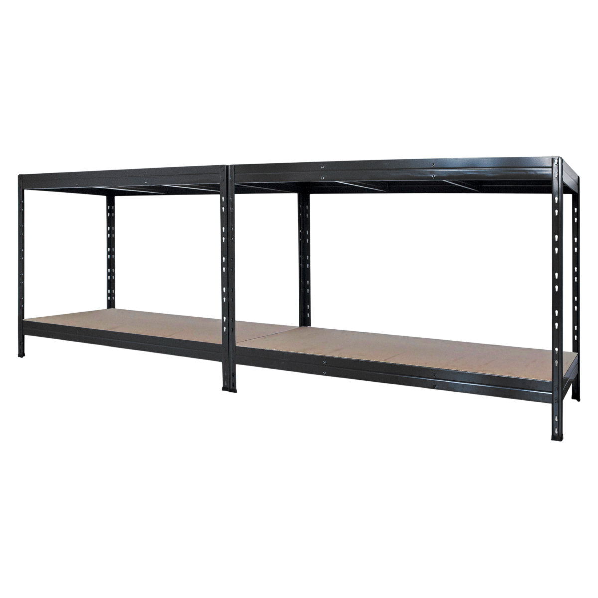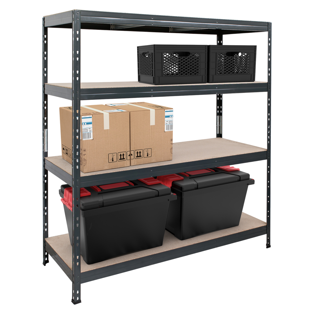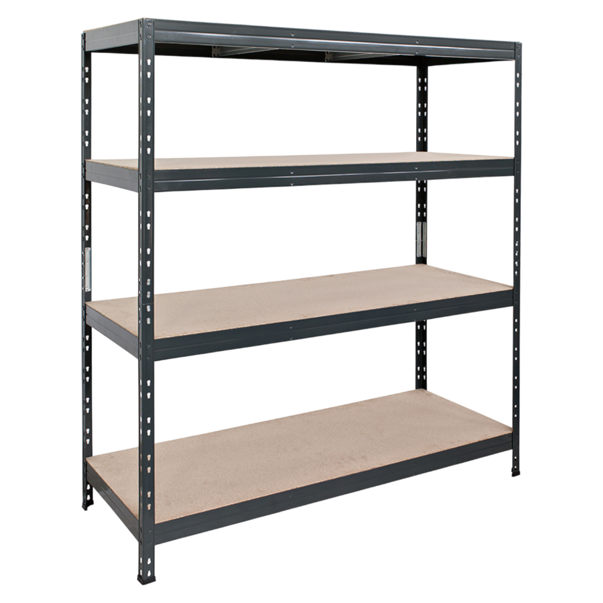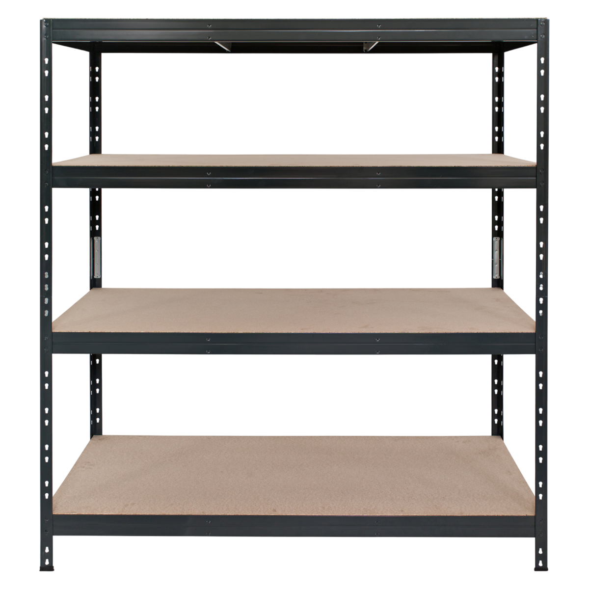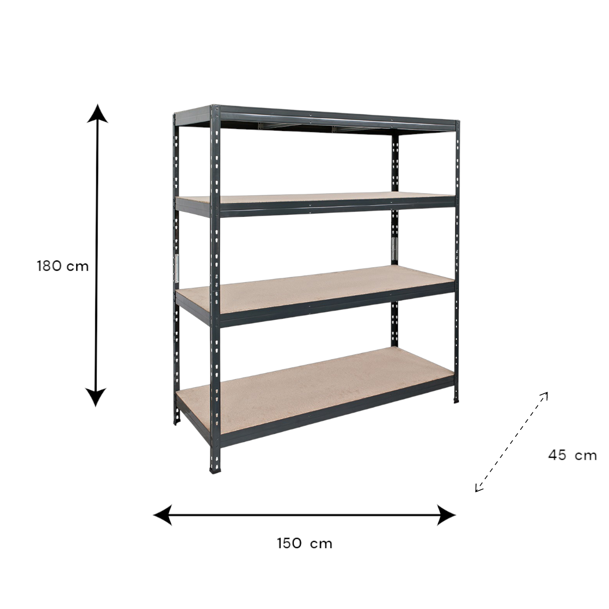 Az AR Shelving Rivet XL 4 polcos antracit fémpolc megbízható és masszív tárolómegoldás garázsokba, műhelyekbe vagy raktárhelyiségekbe. A 180×150×45 cm-es extra széles polcegység HDF fa polclapokat és robusztus acélvázat kombinál, amely polconként akár 400 kg teherbírást is biztosít.