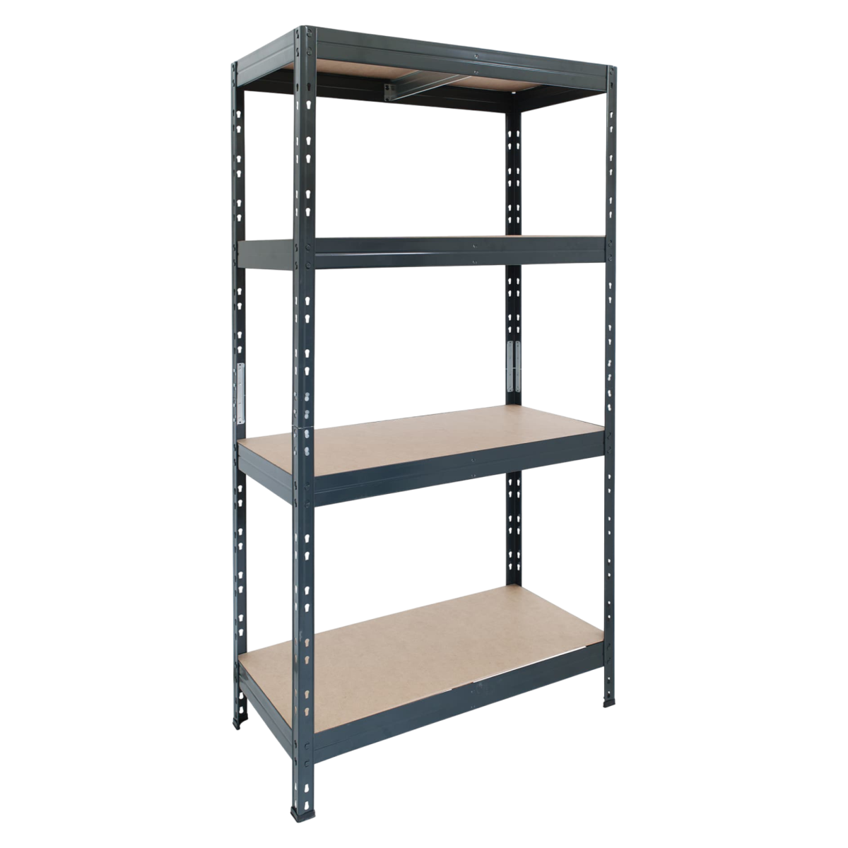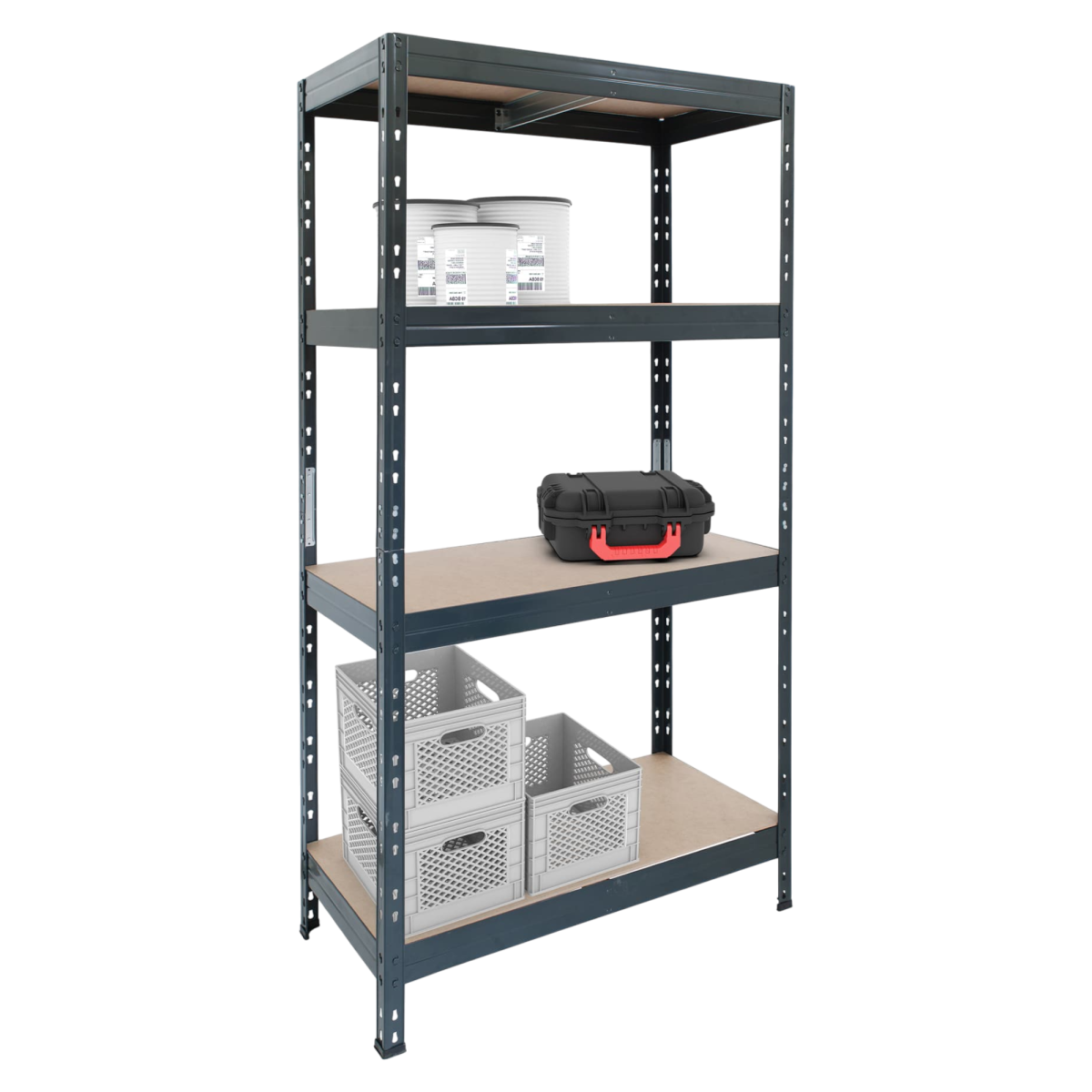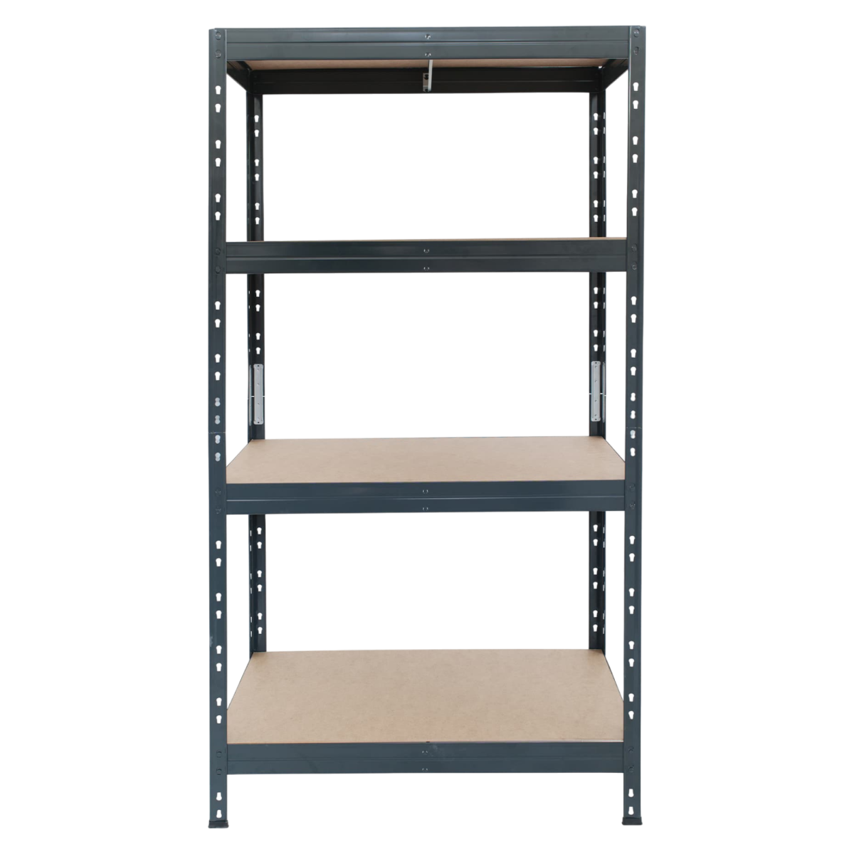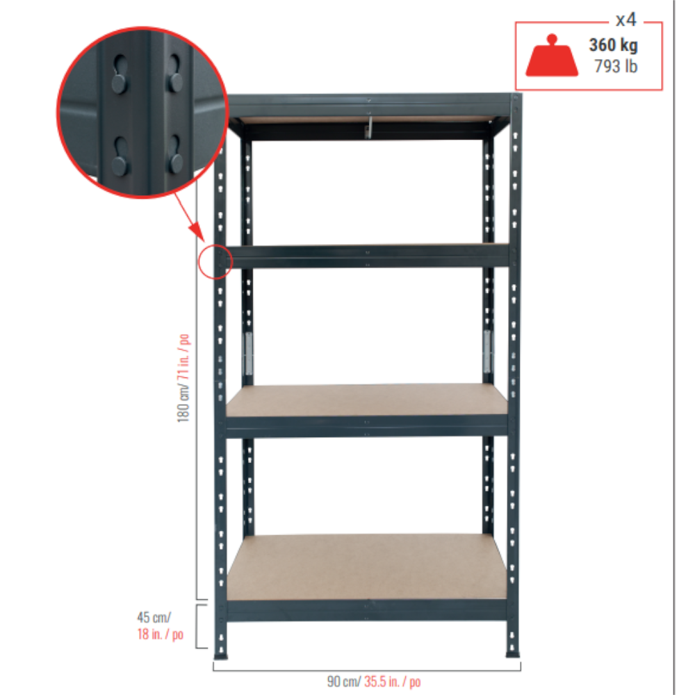 A Rivet antracit fémpolc 180x90x45 cm méretű, 4 polcos kivitelben ideális tárolási megoldás garázsba, műhelybe vagy kisebb raktárba. A csavarmentes szegecsrendszerrel a szerelés gyors és egyszerű, nincs szükség külön szerszámokra.