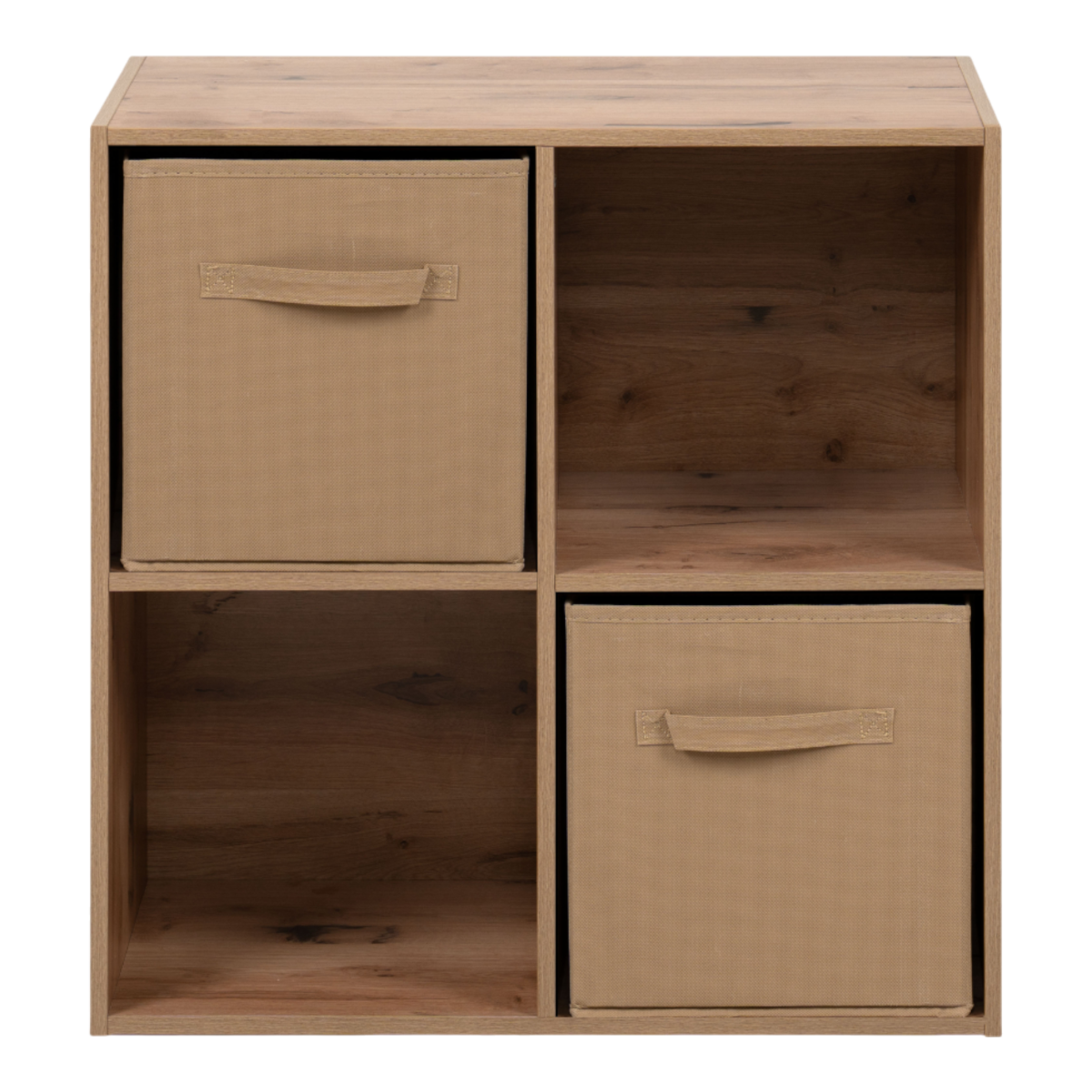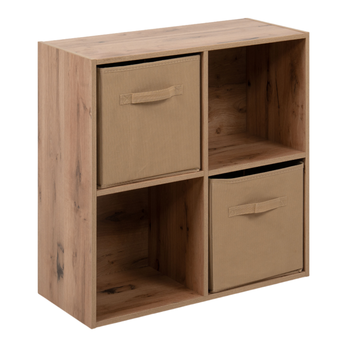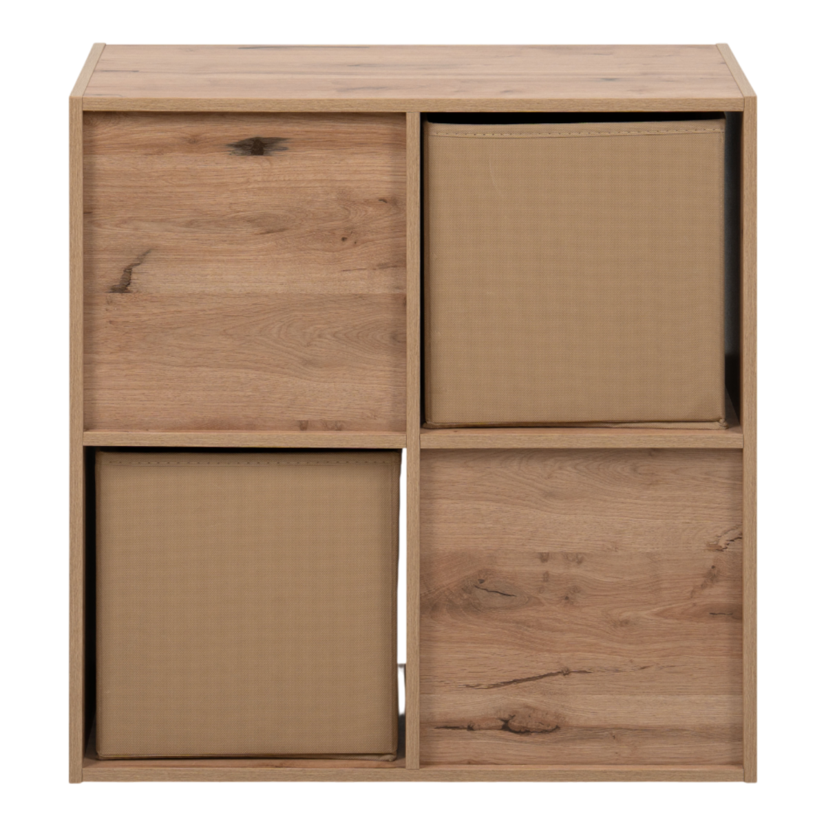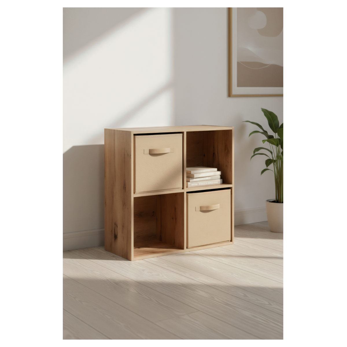 A polc 4 rekesszel és 2 kivehető textildobozzal rendelkezik, így a nyitott és zárt tárolás előnyeit egyaránt kínálja. A textildobozok könnyen mozgathatók, és segítenek elrejteni a kisebb tárgyakat, míg a nyitott részek alkalmasak könyvek, dísztárgyak vagy kosarak elhelyezésére.