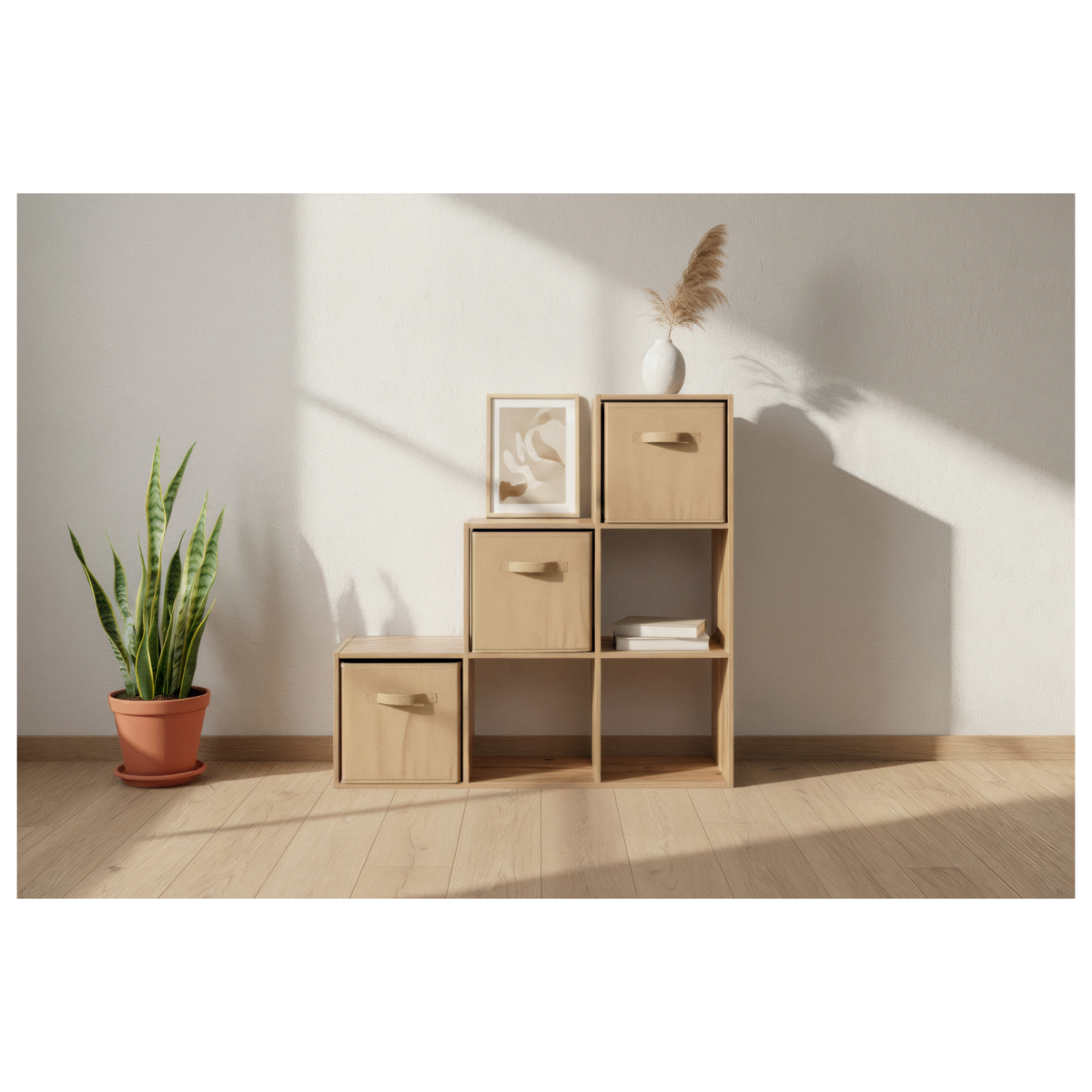 A polc 6 rekesszel és 3 kivehető textildobozzal rendelkezik, így kombinálja a nyitott és zárt tárolás előnyeit. A textildobozok segítségével könnyen rendszerezhetők a kisebb tárgyak, míg a nyitott részek dekorációk, könyvek vagy növények elhelyezésére alkalmasak.