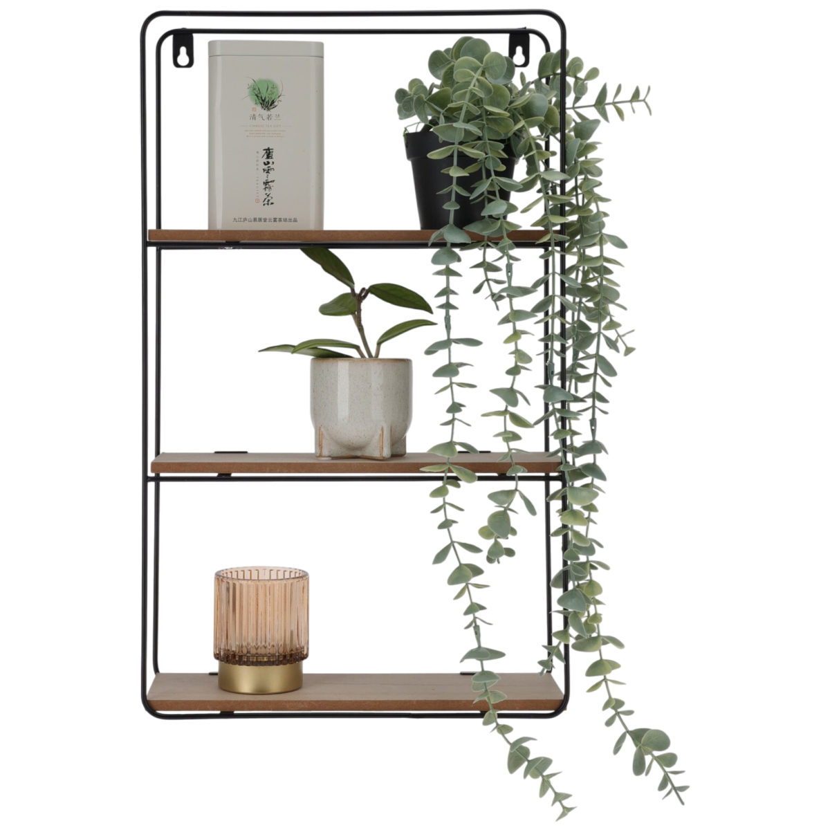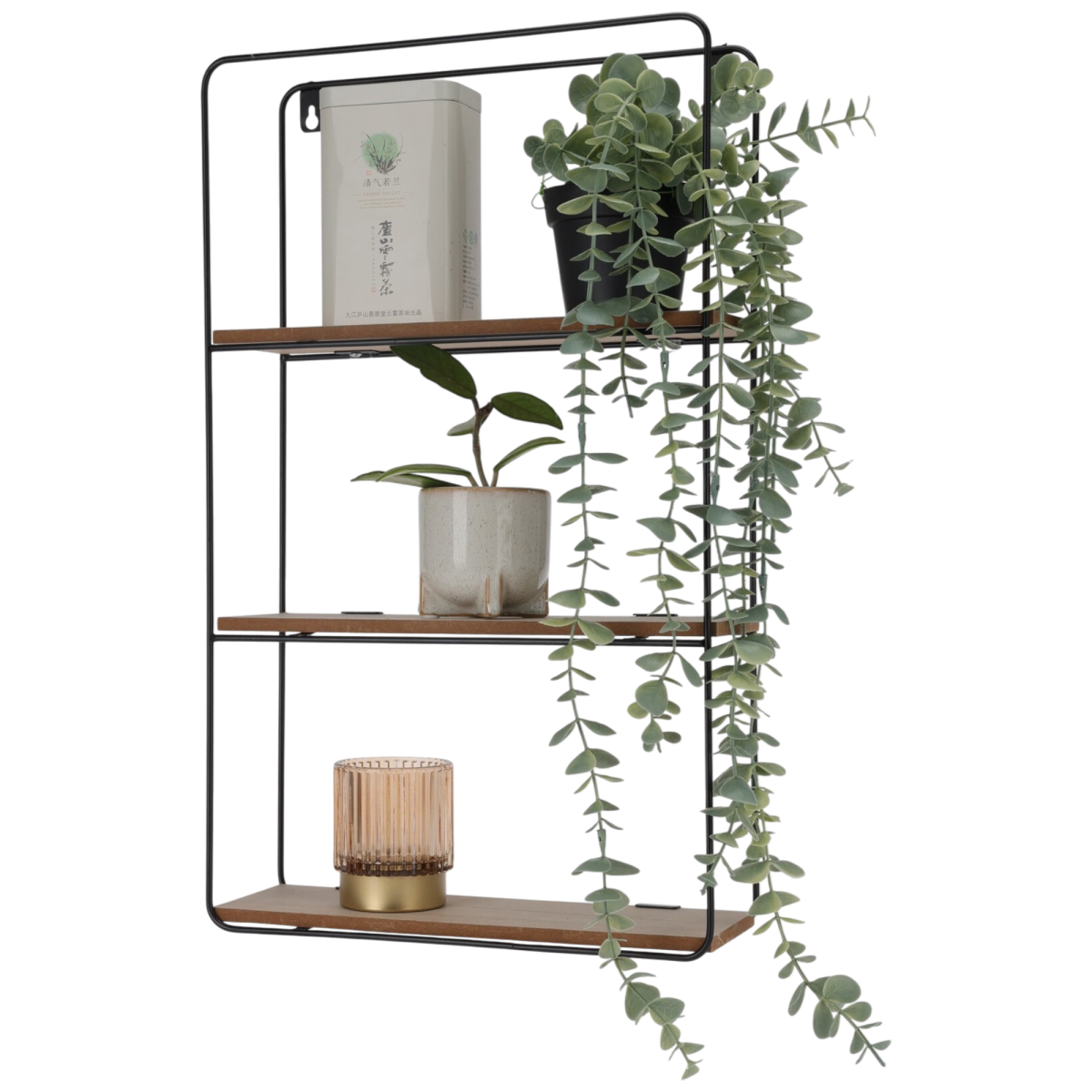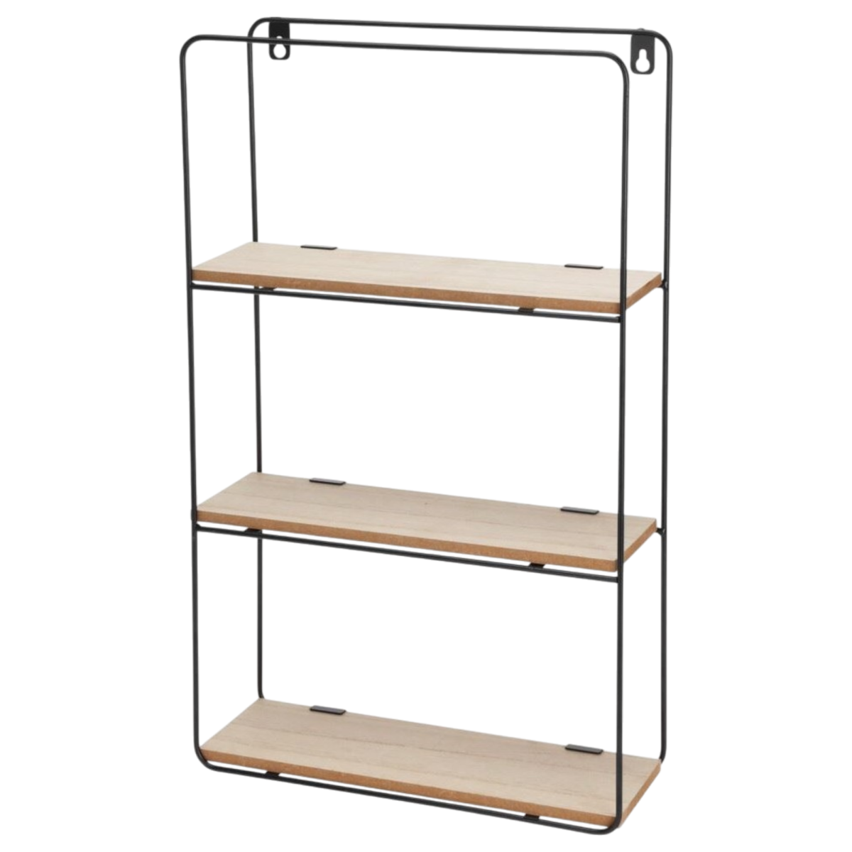 A fekete vas állvány stabil tartást biztosít, míg az MDF fa polcok természetes megjelenést adnak a bútornak. Kompakt méretének (50 cm x 30 cm x 10 cm) köszönhetően kisebb helyiségekben is könnyen elfér, és dekorációk, könyvek vagy kisebb tárgyak tárolására alkalmas.