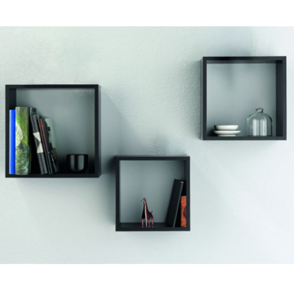 Ez a 3 darabos, kocka alakú fali polc szett modern, letisztult megjelenésével és praktikus kialakításával ideális választás könyvek, dekorációk vagy kisebb használati tárgyak tárolására. A fekete szín elegáns kontrasztot teremt, és könnyen illeszkedik modern, loft vagy minimalista enteriőrökbe.
