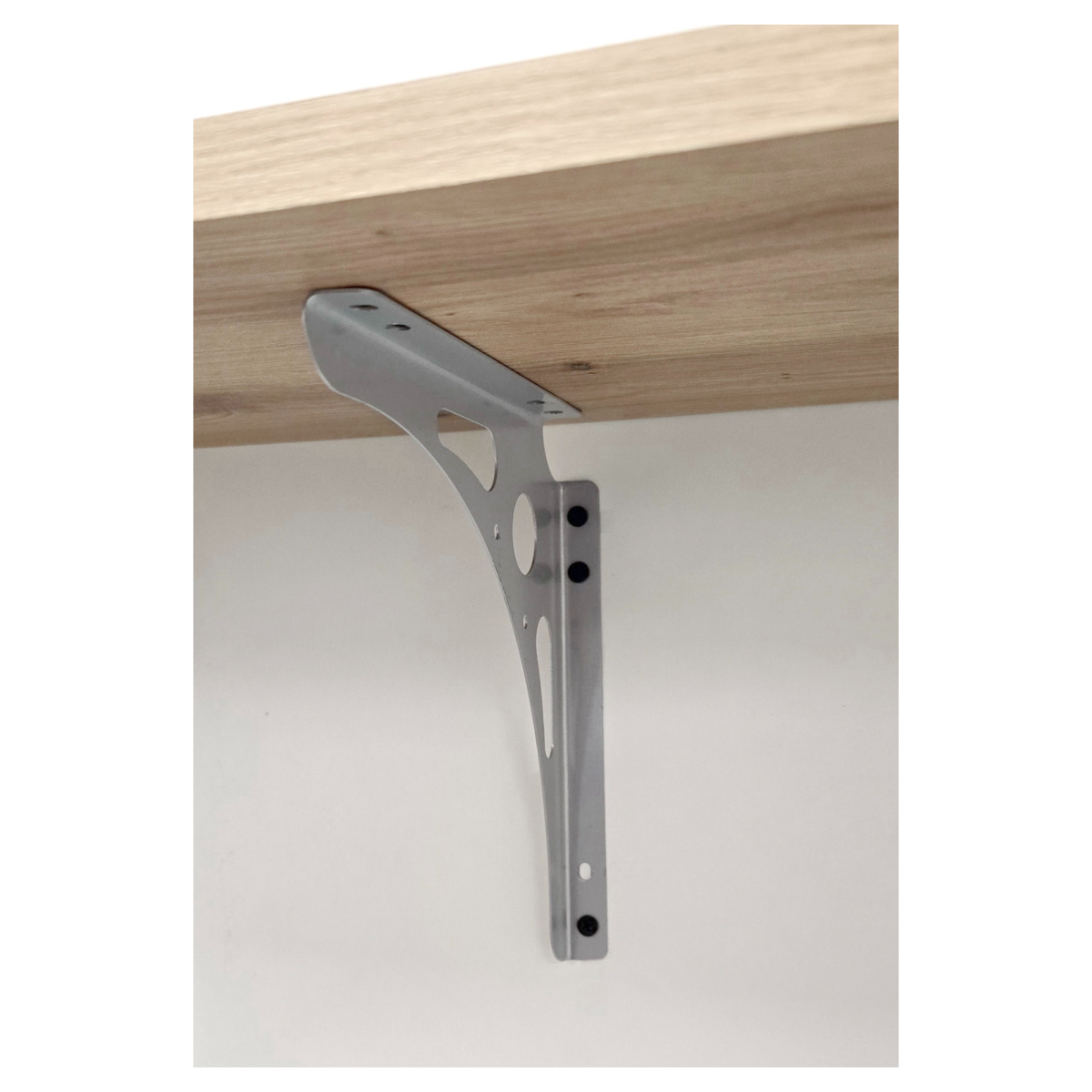 Az univerzális sarokkonzol praktikus megoldás polcok rögzítéséhez beltéri környezetben. A 20 × 20 × 1,8 cm-es méret stabil alátámasztást biztosít, az ezüst szín pedig letisztult, visszafogott megjelenést nyújt különböző enteriőrökben.