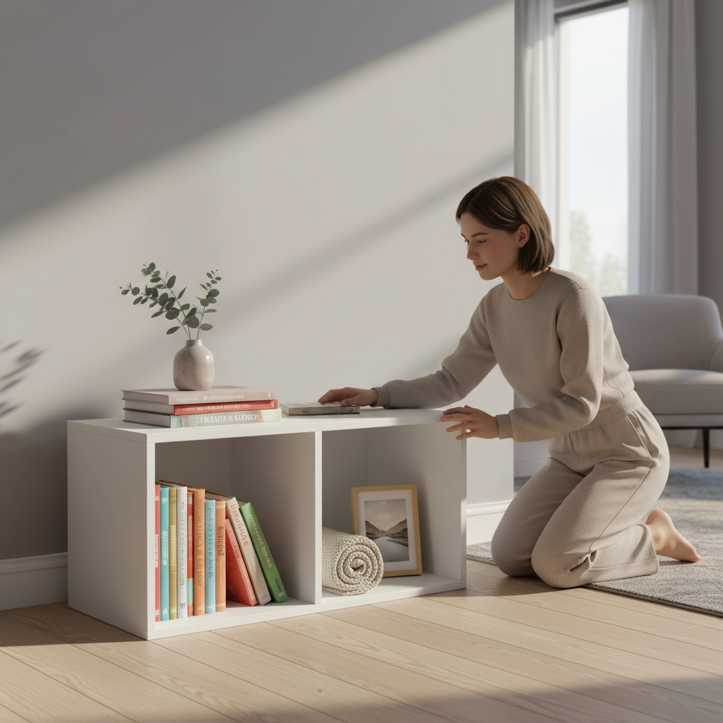 A két nyitott fakk jól átlátható tárolást ad, a fehér felület pedig könnyen illeszkedik bármely enteriőrbe. Vízszintesen és függőlegesen is elhelyezhető, így ott is működik, ahol a falméret vagy a nyílászárók miatt trükközni kell.