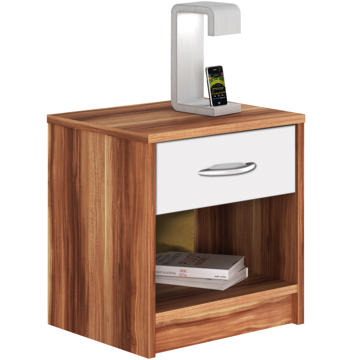"ISIS" Éjjeli szekrény merano/fehér dekor színben, 1 fiókkal. Mérete: 36,6x38,1x29,5cm. Csomagolási méret: 31,8x41x9,5cm.