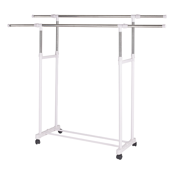Dupla gurulós, állítható fehér ruhaállvány, méretek: 78-130x95-160x43cm.