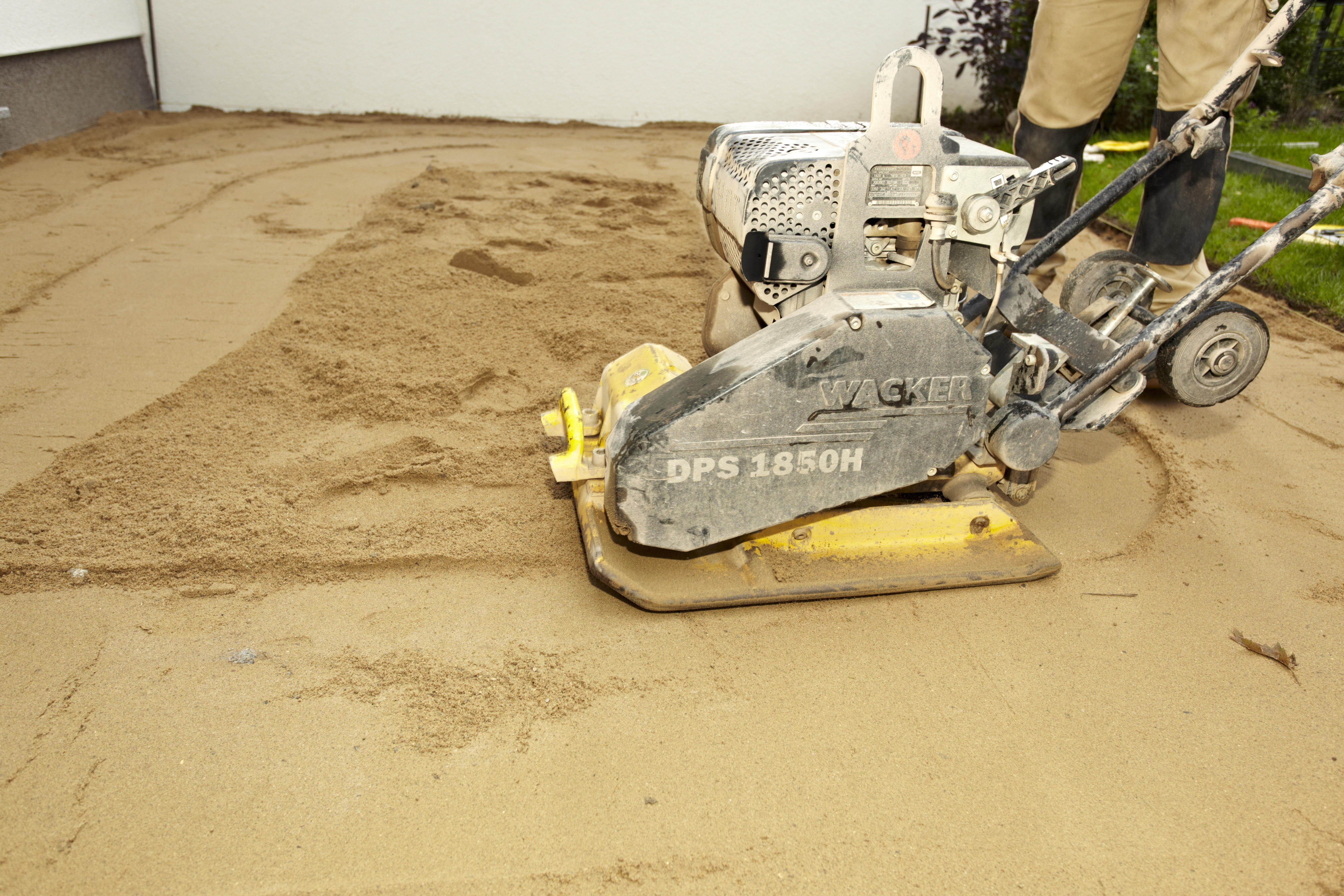 3+4. Hordjunk fel a felületre 0/2 vagy 0/4 szemcsenagyságú homokréteget a szintjelző zsinór által megadott vastagságnak megfelelően!