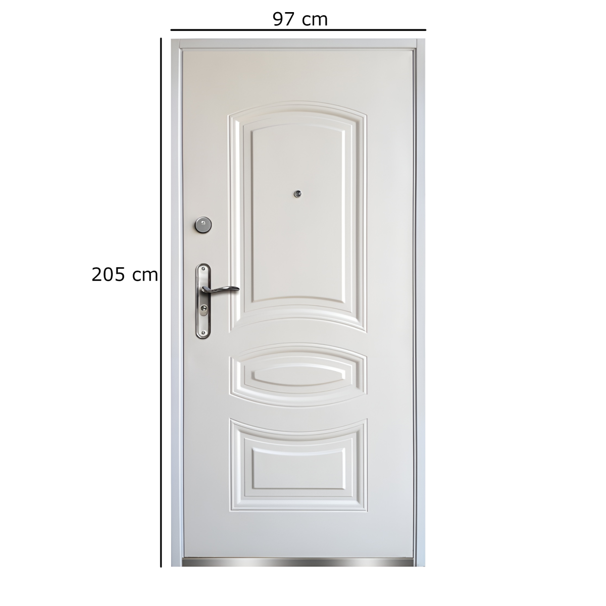 A 97 cm x 205 cm-es méret beépítési méretként értendő, az ajtó szárnyvastagsága pedig 50 mm. A beépített kitekintő és a többpontos zárás biztonságosabb használatot nyújt, míg a rozsdamentes küszöb a mindennapi igénybevétel mellett is tartósabb megoldás.