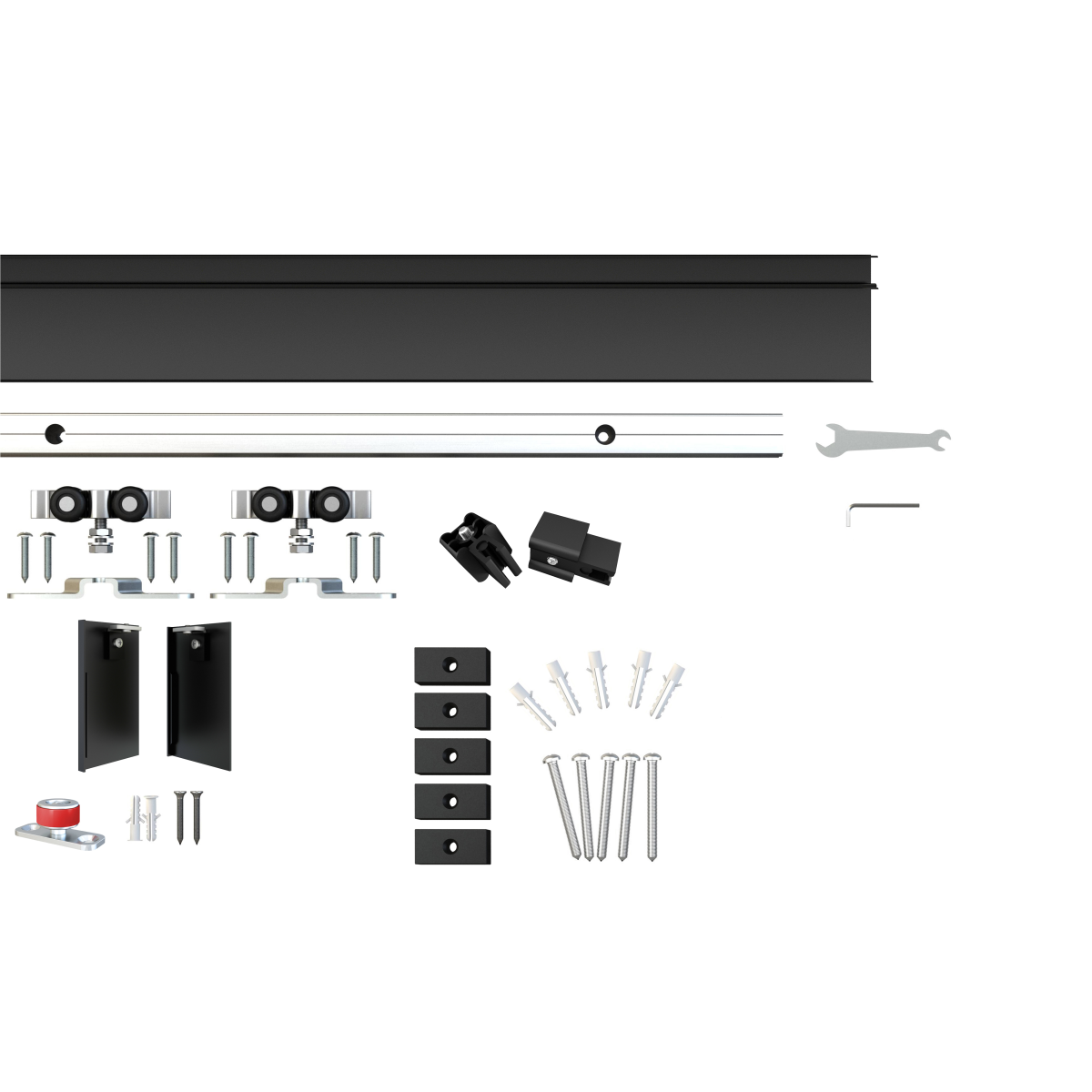 Fekete színű sínrendszer görgőkkel, kiugrásgátlóval, alsóvezetőrésszel, és a többi szükséges alkatrésszel tolóajtokhoz. A sínrendszer az alábbi tolóajtó üveglappal kompatibilis: Üveg tolóajtó lap savmart fekete alu kerettel ASB-004 (422231).