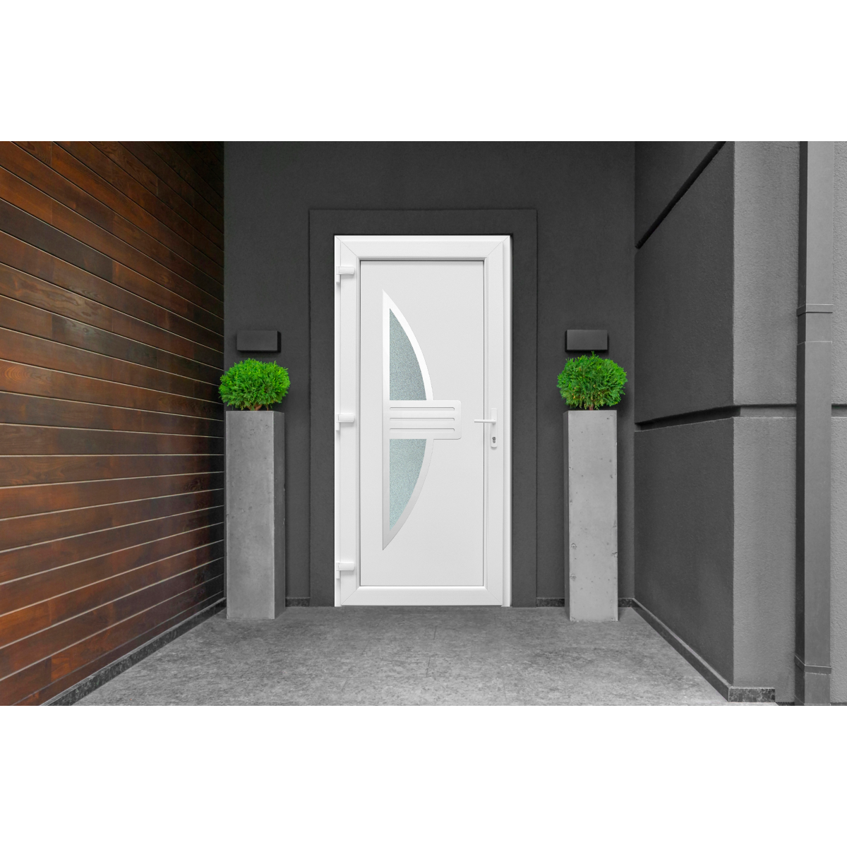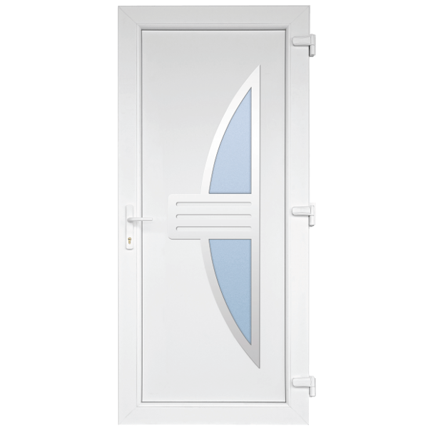 Műanyag bejárati ajtó fehér színben, kilincsel. A bejárati ajtó az otthon egyik legfontosabb eleme, amely nemcsak a külső hőmérséklettől és csapadéktól védi a lakást, hanem a biztonságot is szolgálja.