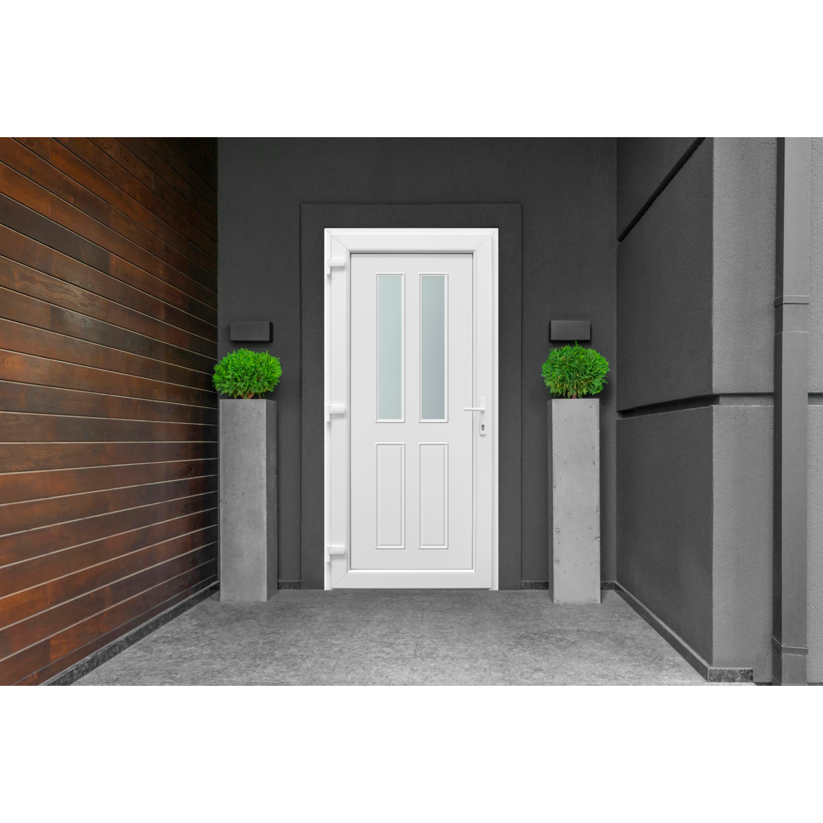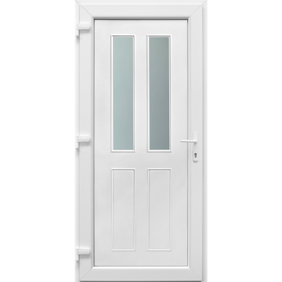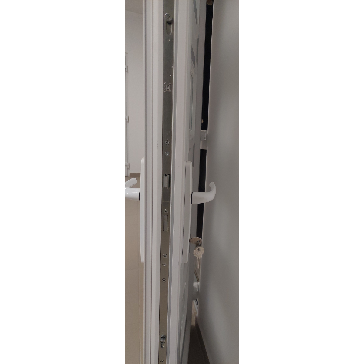 Szicília műanyag bejárati ajtó, fehér színben, satinato üvegezéssel, kilinccsel. Mérete 98x208cm, balos nyílásiránnyal. 70-71 mm vastagprofilrendszer. 5 ponton záródó, kilincs működtetésű zárszerkezet. Három darab három dimenzióban állítható ajtópánt. Állítható zárfogadó vasalat. Zárbetét nélkül.