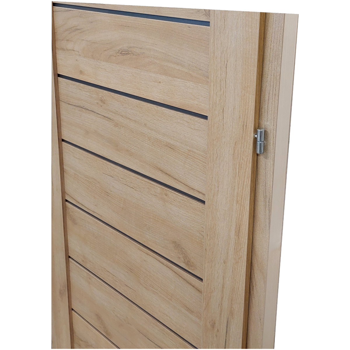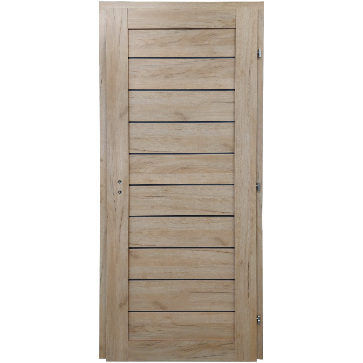 A Fonyód tele kivitelű beltéri ajtó 90×210 cm-es falnyíláshoz készült, jobbos nyitásiránnyal. A 42 mm vastag, falcolt szerkezetű ajtólap papírrács betéttel készül, partmenti tölgy színű HDF felülettel. A két betét között 10 mm-es, látszó antracit színű csík ad modern, karakteres megjelenést.
