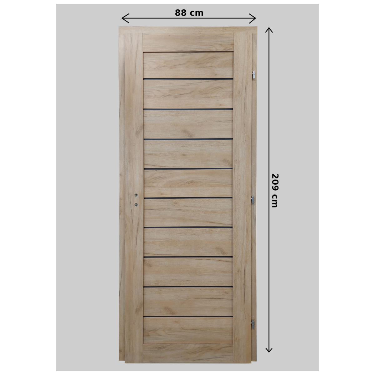 A megadott méret a falnyílás méretére vonatkozik, az ajtó tényleges mérete ennél 1–2 cm-rel kisebb. A kép illusztráció, a termék jobbos nyitásirányú. Kilincs nem tartozék.
