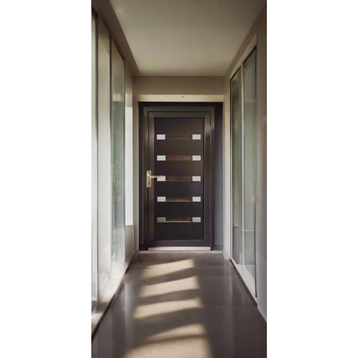 Hidas műanyag, jobbos bejárati ajtó, belül fehér, kívül antracit, alurátéttel. Beépítési mélység: 70mm. Tokprofil hőszigetelési értéke: Uf=1,3W/m2. Üvegezés: 4-16-4-es Low-e+Argon (átlátszó) üveg, Ug=1,1W/m2. Vasalat: 5 pontos kilincs működtetésű ajtó zár, 3 db erősített 3D pánt, 20 mm magas alumínium küszöb. A beépítés helyének kiválasztásakor kérjük, legyenek figyelemmel arra, hogy a színes fóliával ellátott bejárati ajtókat közvetlen napsugárzás nem érheti (félig sem), mert az ilyen helyre történő beépítés a garancia elvesztésével jár. A feltüntetett kép illusztráció; a termék nyitásiránya jobbos. Tartozékok: zár, zárbetét, kulcs, kilincs.