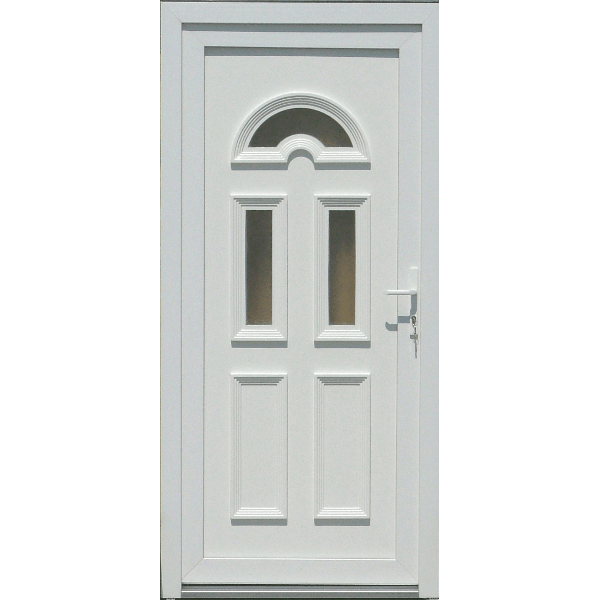 Műanyag bejárati ajtó TEMZE, 3 csincsilla üveges, jobb nyílásirányú(kilinccsel), 5 légkamrás. Mérete:100x210cm. Nyitásirány: jobb. (Nyitásirány meghatározása, jobbos, balos ajtó/ablak: Szembe kell állnunk az ajtóval/ablakkal, úgy hogy felénk nyíljon. Amelyik kezünk felé esnek az ajtó/ablak pántjai (zsanérjai), olyan nyitásirányú az ajtó/ablak.) Tartozékok: zár (5 ponton zárodó zárszerkezet), biztonsági zárbetét (40/50mm), kulcs, kilincs.