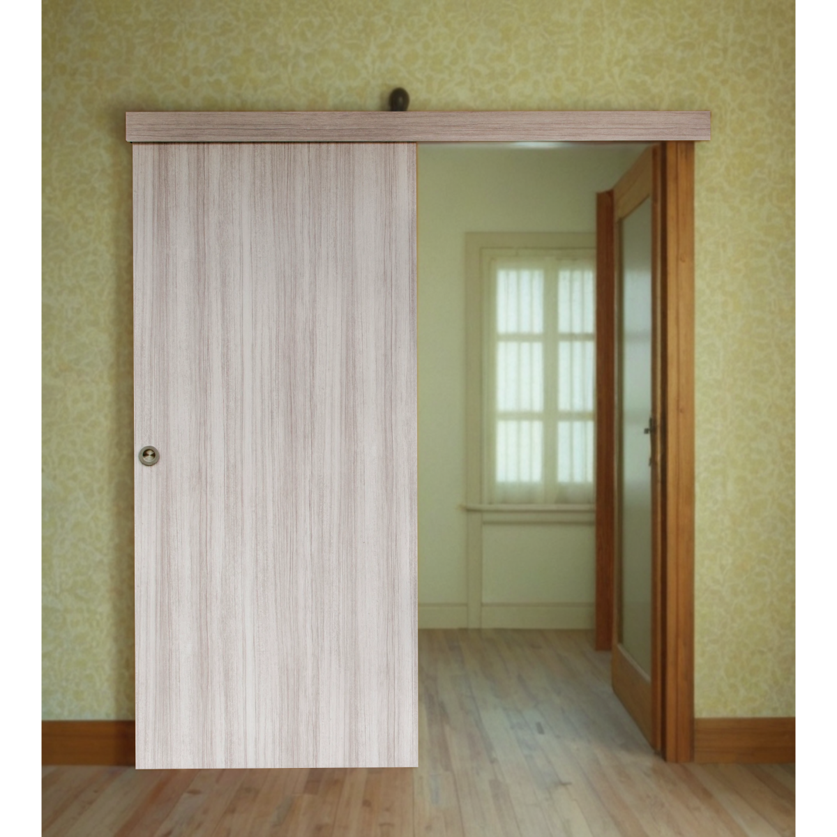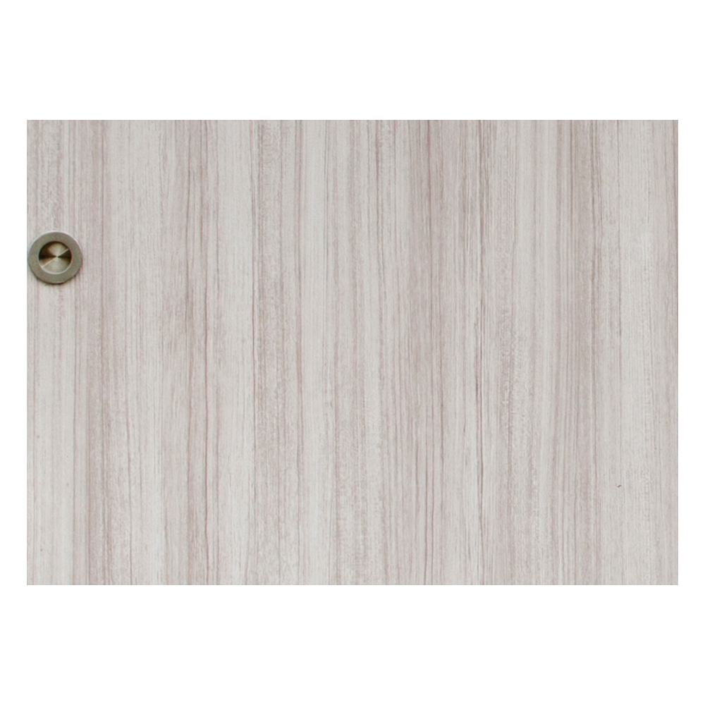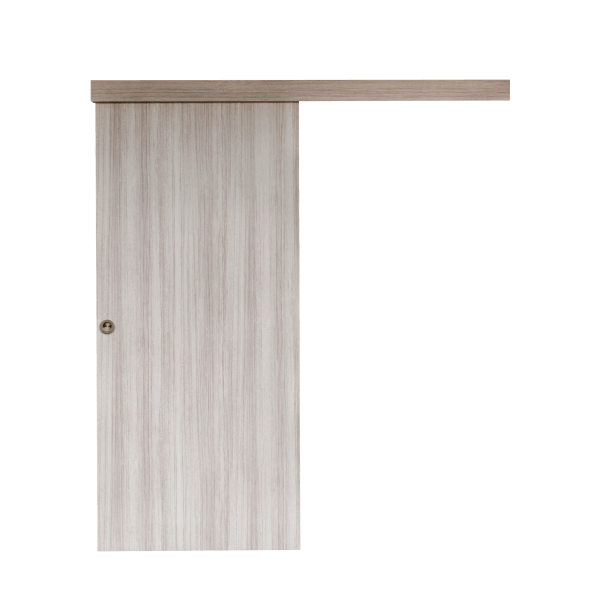 Falsíkon kívül szerelhető beltéri tolóajtó sínborítással 90x206 cm méretű falc nélküli ajtólap tolóajtó vasalattal, az ajtólap színével megegyező sínborítással, eloxált ezüst színű kör alakú tolókagylóval, zár nélkül. 39 mm vastagságú ajtólap, 2 mm vastagságú műanyag sík borítással, papírrács betéttel, 0,2 mm vastagságú ST002 white teak színű PVC felülettel.