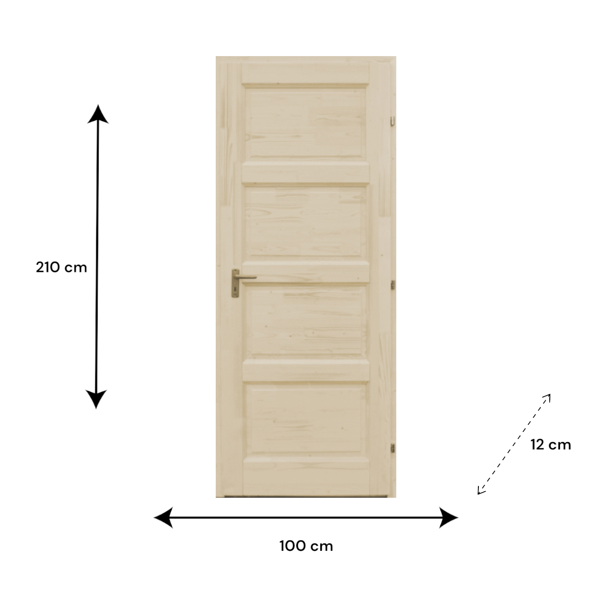 A 100×210 cm-es beépítési méretű, jobbra nyíló ajtó esetében, ha szemben állsz vele és az ajtó feléd nyílik, a pántok (zsanérok) a jobb oldalon találhatók. Az ajtó zárral, zárbetéttel és kulccsal együtt kerül forgalomba, azonban kilincs nélkül kapható, így könnyen személyre szabható a választott kilincstípus szerint.