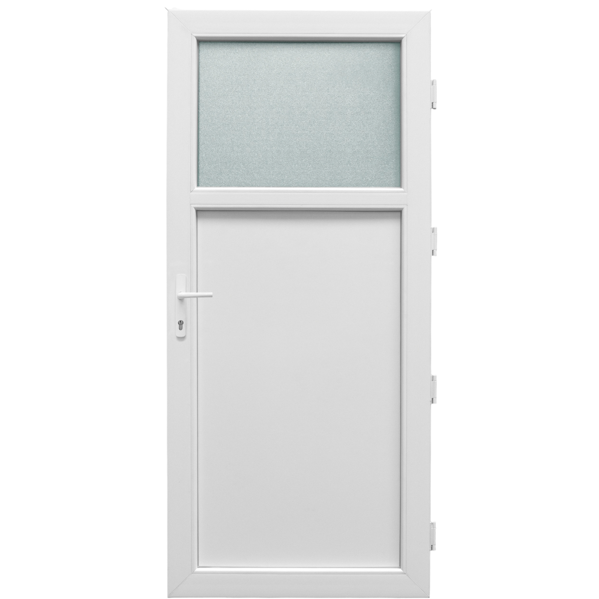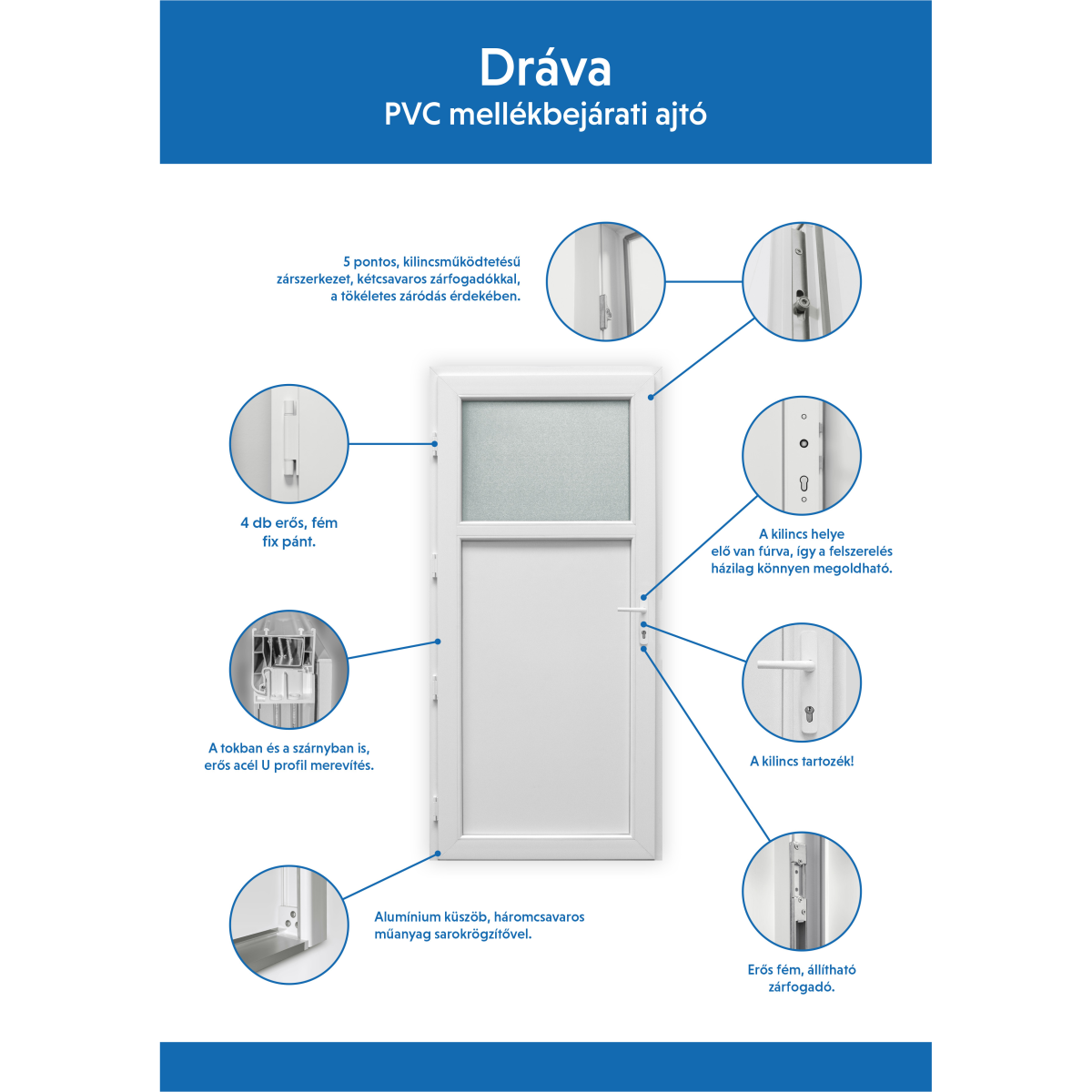 60 mm vastag PVC profil. Zárbetét nélkül értékesítjük. A kilincs tartozék. Erős U-acél merevítés az ajtótokban és az ajtószárnyban is. 5-ponton záródó kilincs működtetésű zárszerkezet. 4 db erős fém fix ajtópánt. Gyárilag előfúrt lyukak a tartozék kilincs felszereléséhez!