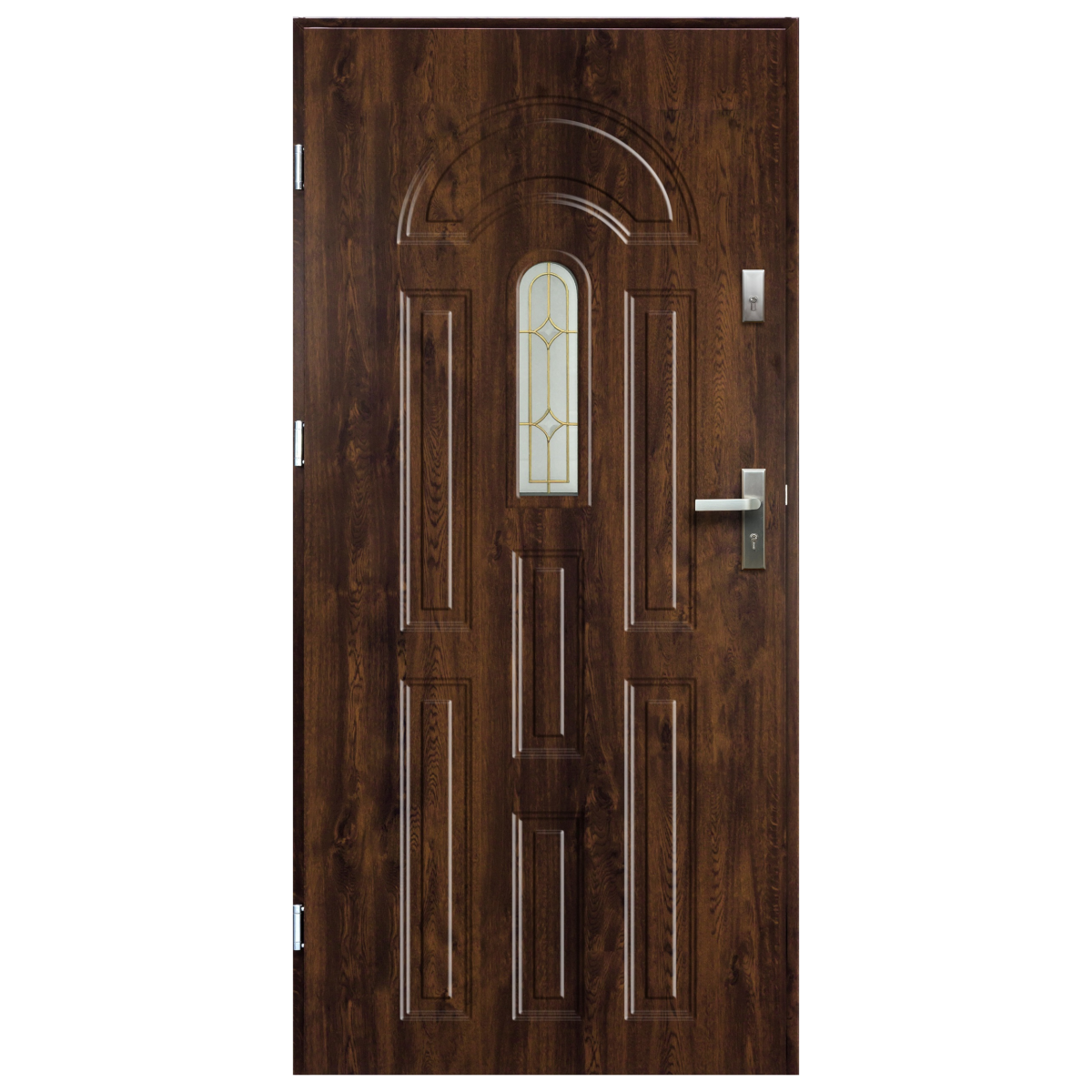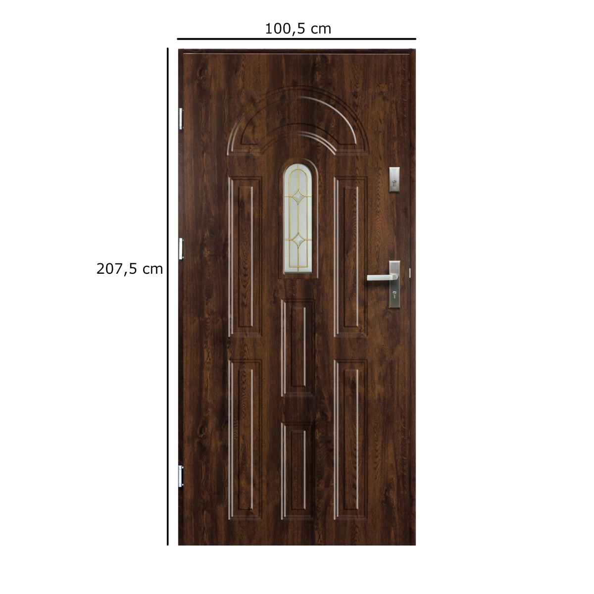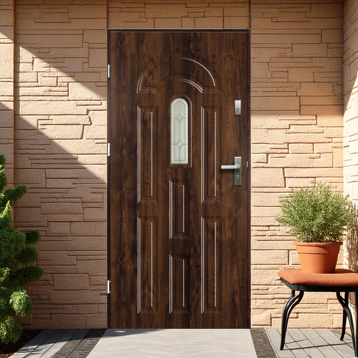 Az Eris kültéri bejárati ajtó sötét dió színben, klasszikus mintázattal és üvegbetéttel elegáns megoldást kínál családi házakhoz és társasházakhoz.