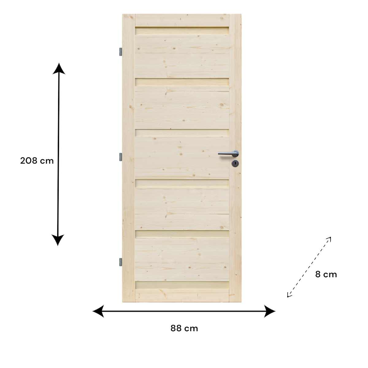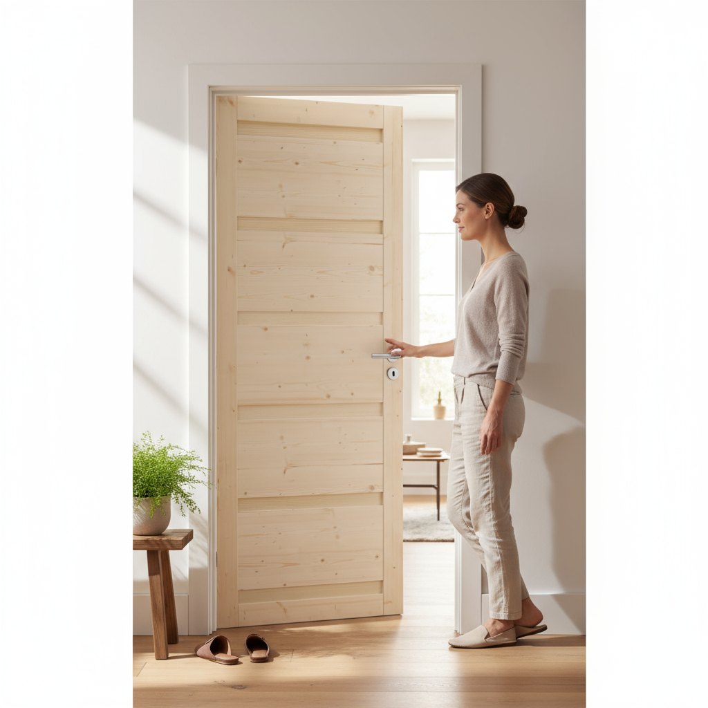 Az Etna tele beltéri ajtó fenyőfából készült, letisztult megjelenésű megoldás mindennapi használatra. A 90×210 cm-es, balra nyíló kivitel a legtöbb szabvány nyílásba illeszkedik, a 8 cm-es gerébtokkal szerelt kialakítás pedig stabil beépítést tesz lehetővé.