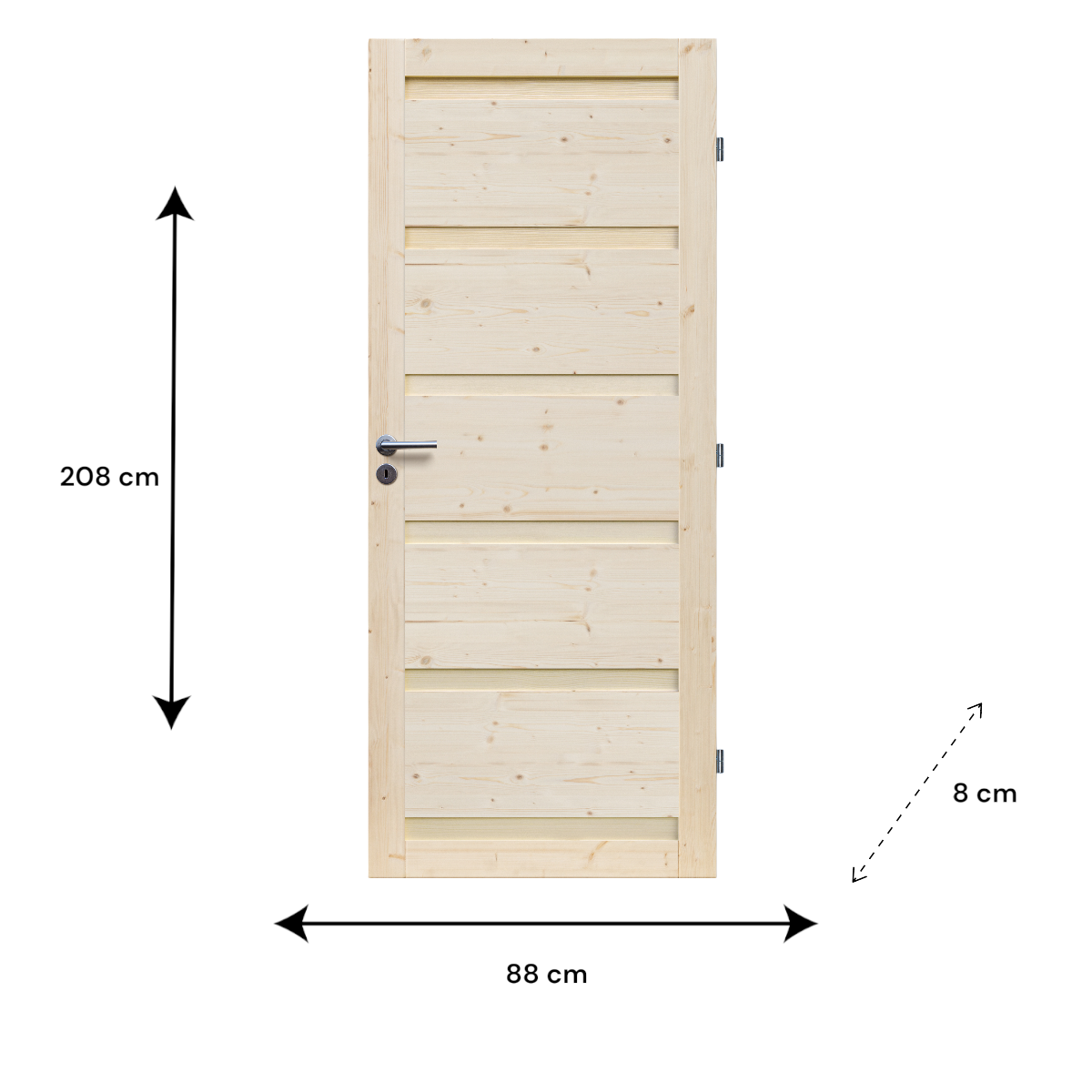 Az Etna tele beltéri ajtó fenyőfából készült, letisztult megjelenésű megoldás mindennapi használatra. A 90×210 cm-es, jobbra nyíló kivitel a legtöbb szabvány nyílásba illeszkedik, a 8 cm-es gerébtokkal szerelt kialakítás pedig stabil beépítést tesz lehetővé.