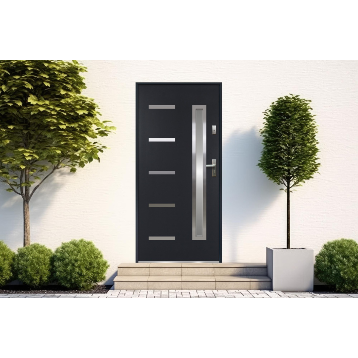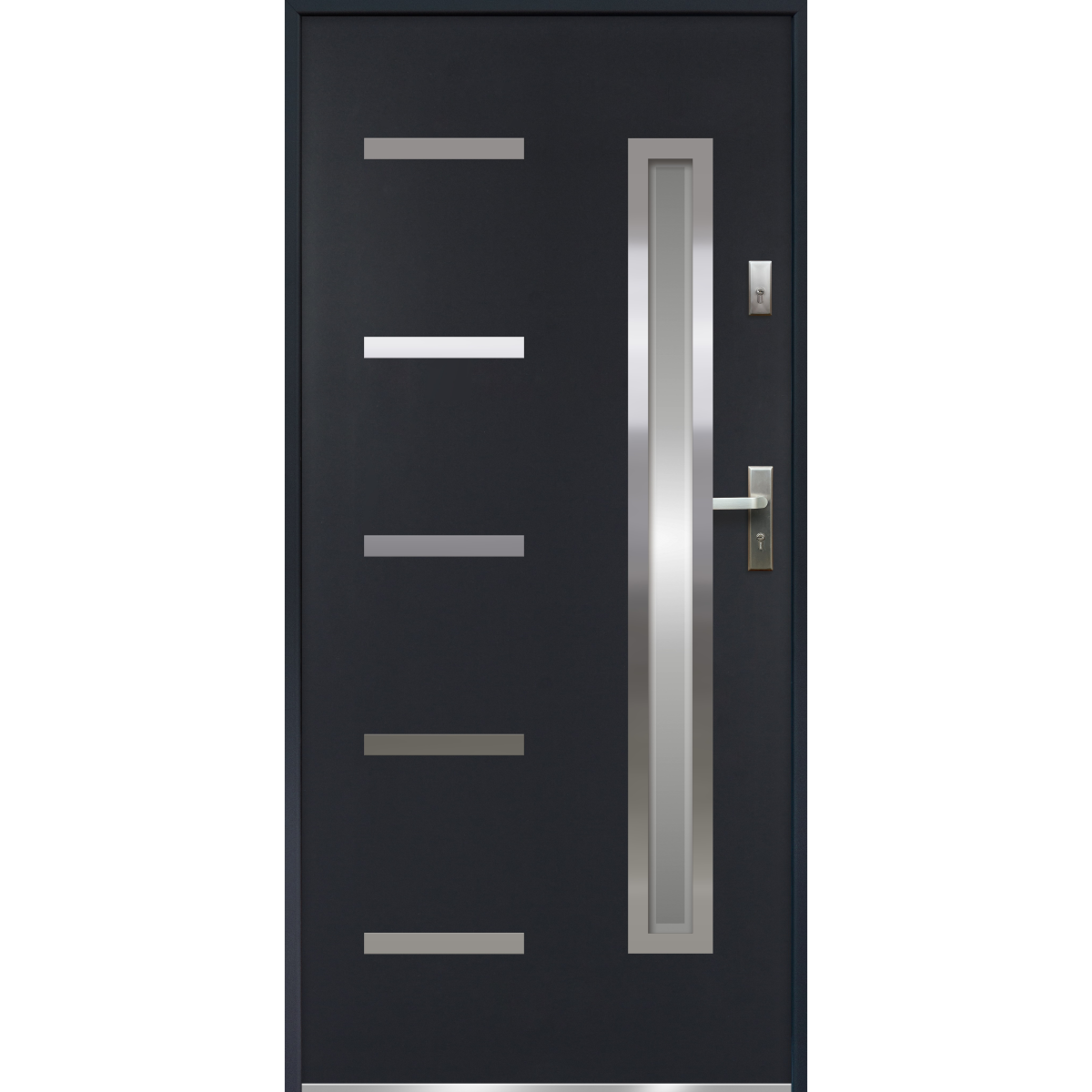 A Juventus acél kültéri bejárati ajtó a megbízhatóságot és a modern megjelenést ötvözi. Antracit színű felületével elegáns, letisztult hatást kelt, amely jól illeszkedik modern homlokzatokhoz.
