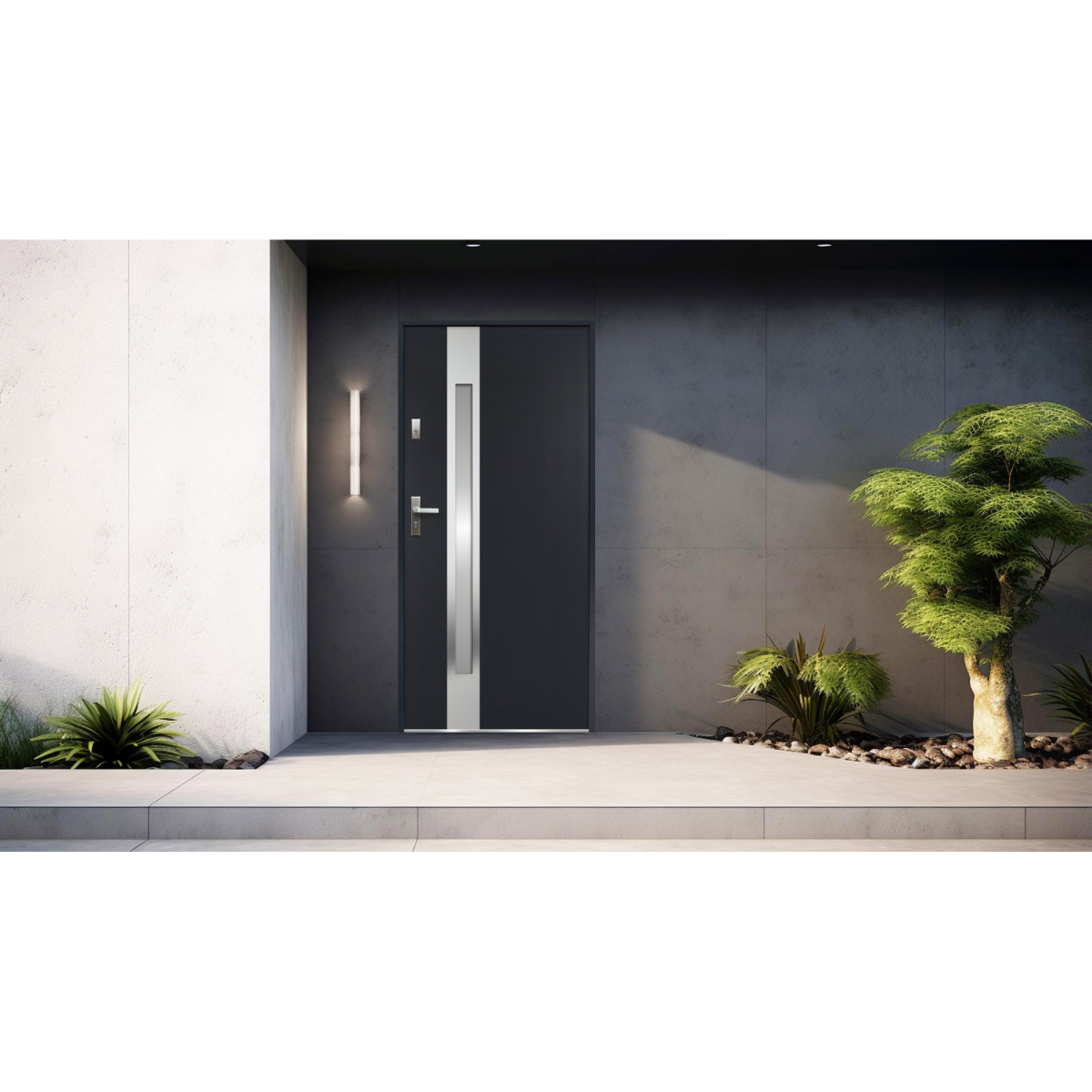 Az ajtó szárnyvastagsága 55 mm préselt acéllemez. Szigetelése habosított polisztirol. Lemez vastagsága: ( ajtó keret/ajtólap ) - 1,2 mm/0,6 mm. Felülete UV álló PVC dekorfóliával van bevonva. Homokfúvott üveg. Az ajtó 2 független zárszerkezettel, valamint 3 állítható zsanérral van felszerelve, 180 fokos nyitási tartományban nyitható. Tömítés a keretben és a küszöbön. Küszöbbel ellátott ajtókeret. Kiemelésgátlóval ellátva. A beépítési egységcsomag tartozék: kilincs, zárbetét. Tokkal együttes külméret 100x207cm, a beépítéshez szükséges minimum falnyílás mérete: 102x208cm.