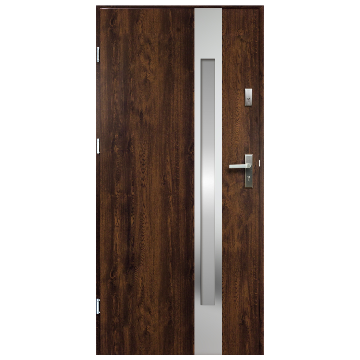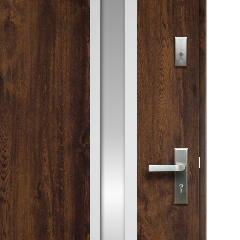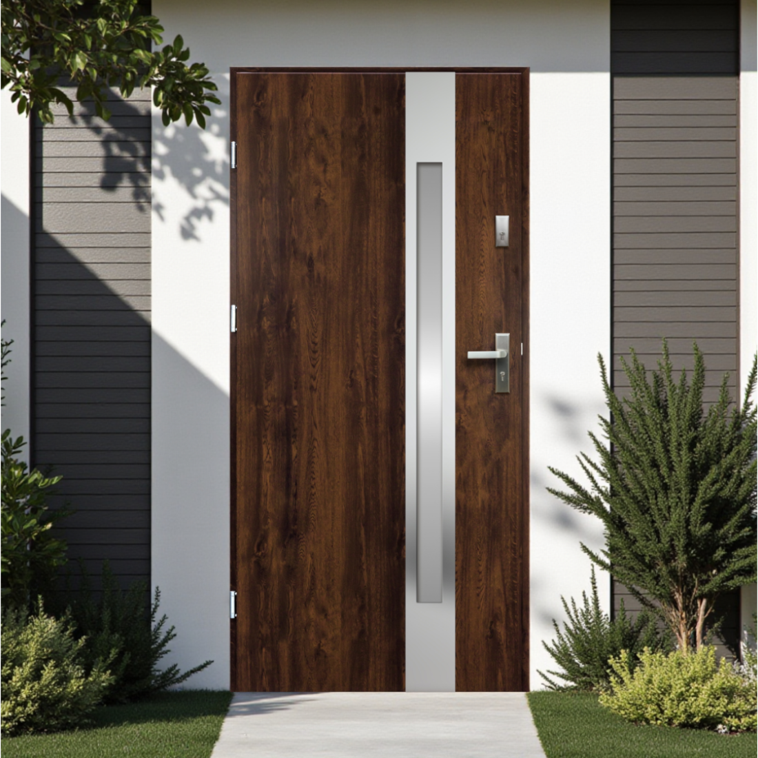 A Temida acél kültéri bejárati ajtó sötét dió mintázatával meleg, otthonos hatást ad a bejáratnak, a homokfúvott üveg pedig beengedi a fényt, miközben diszkrétebb takarást biztosít.