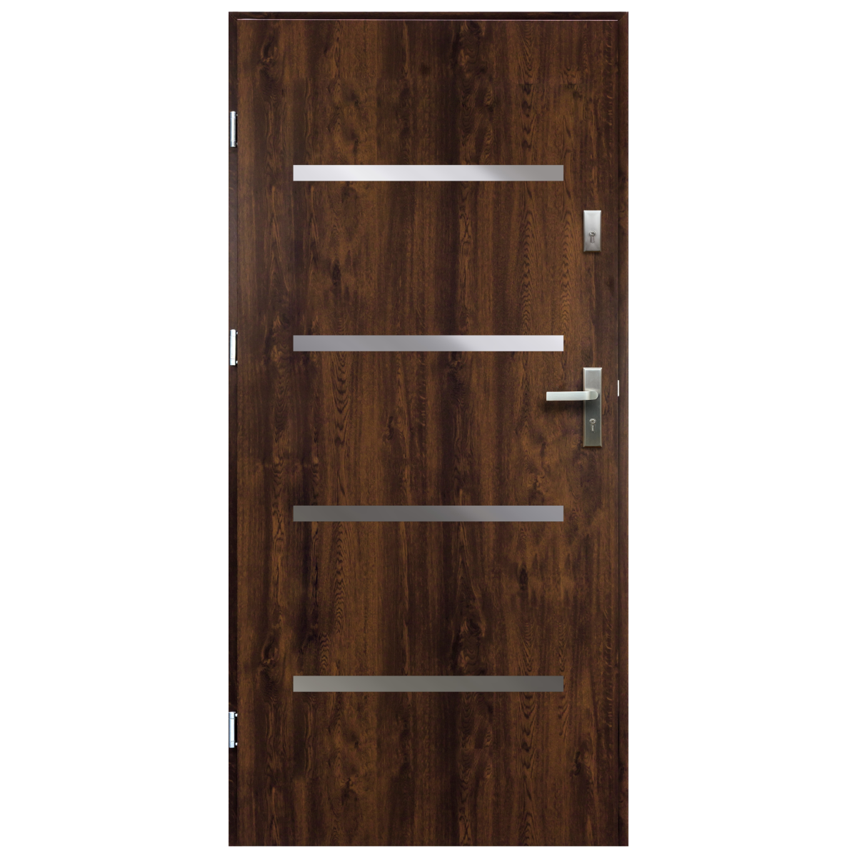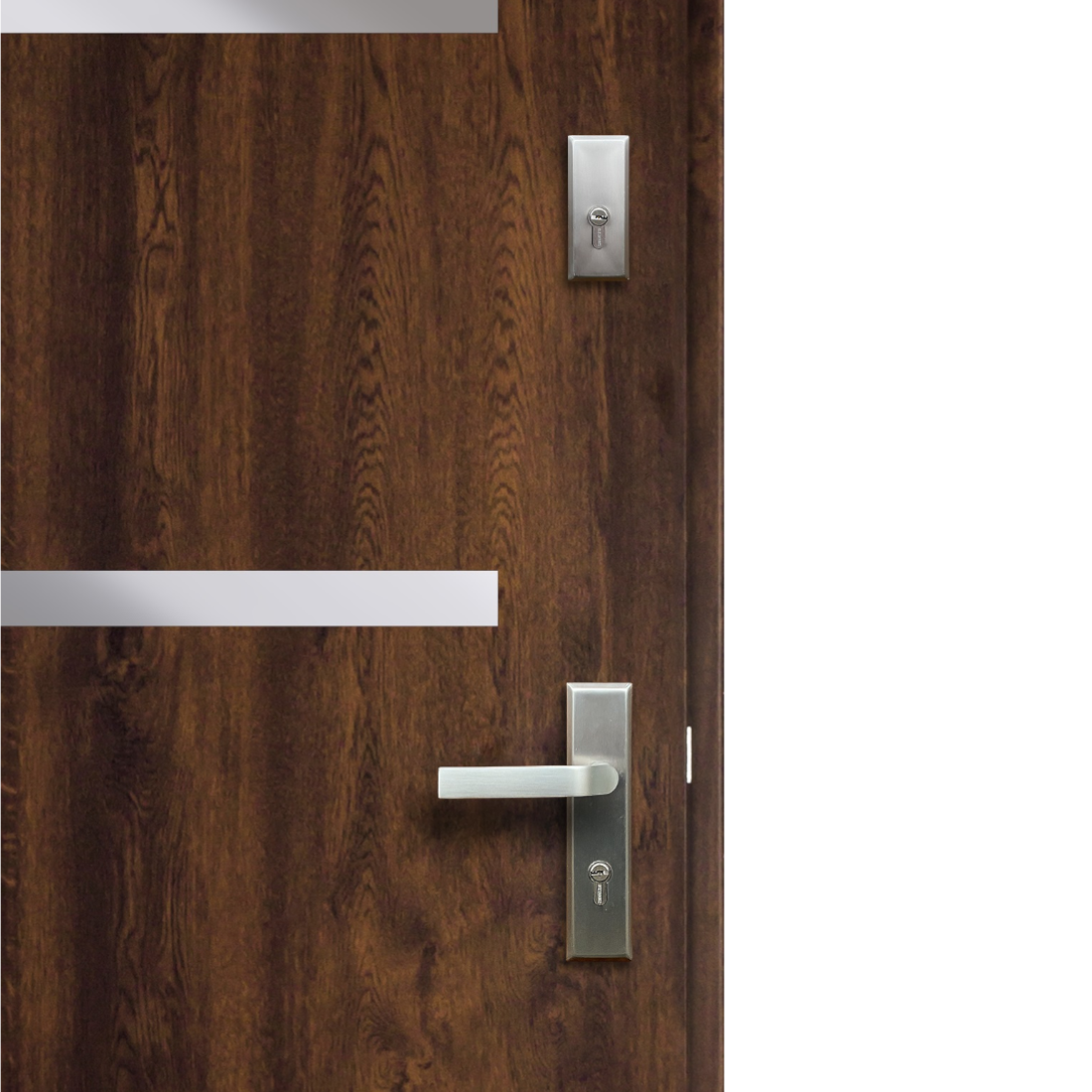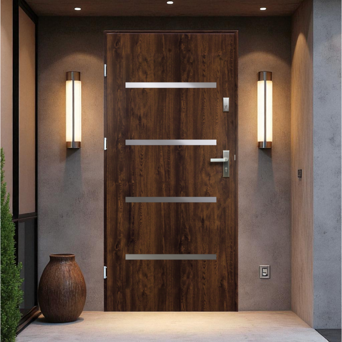 A Westa kültéri bejárati ajtó tiszta sötét dió megjelenésével otthonos, modern belépőt ad a homlokzatnak, a vízszintes díszítések pedig visszafogott, egységes képet teremtenek.
