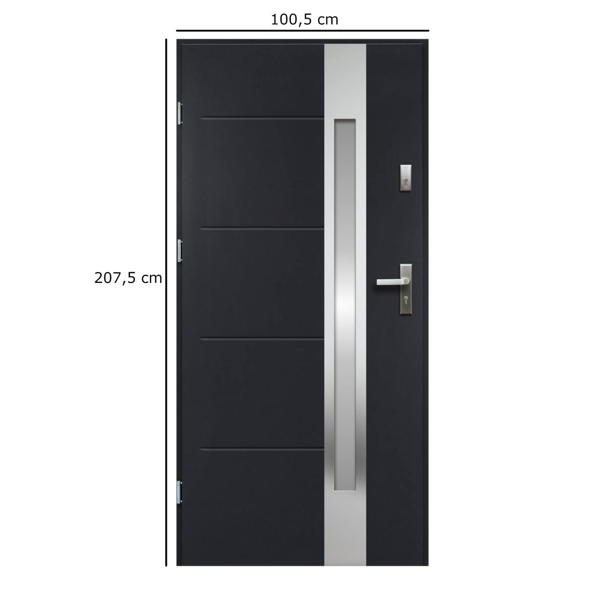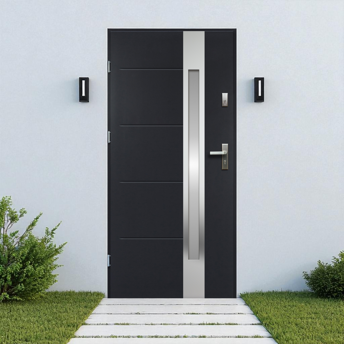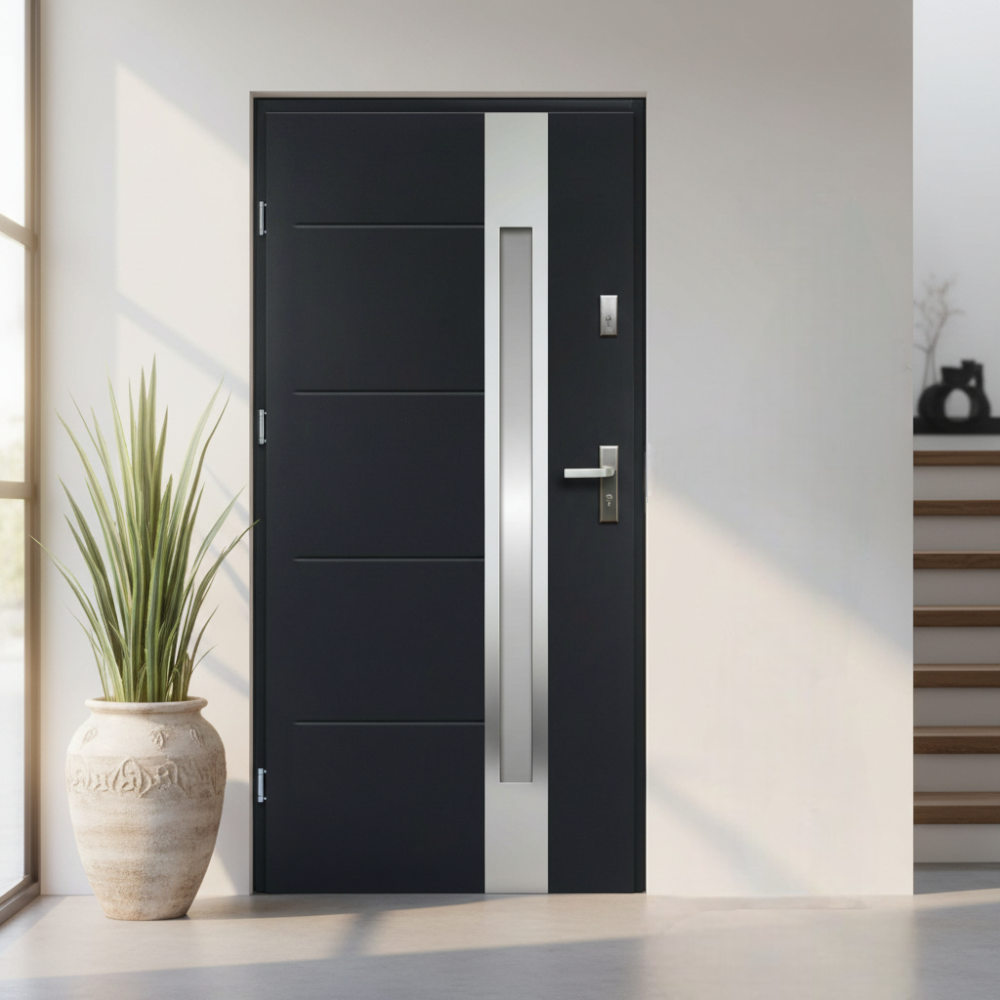 Az Ariadna kültéri bejárati ajtó antracit színben elegáns és időtálló megoldást kínál családi házakhoz és társasházakhoz.
