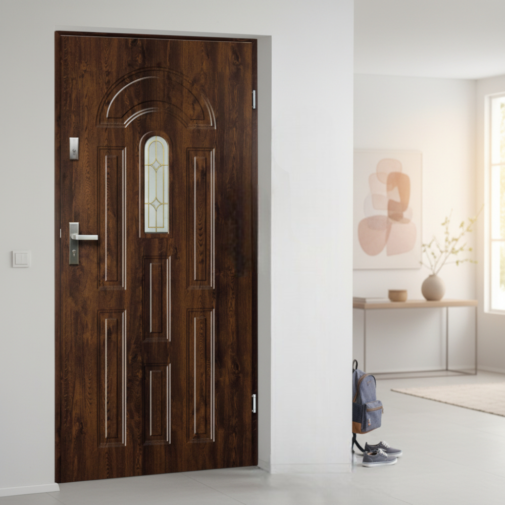 Az Eris kültéri bejárati ajtó sötét dió színben, klasszikus mintázattal és üvegbetéttel elegáns megoldást kínál családi házakhoz és társasházakhoz.