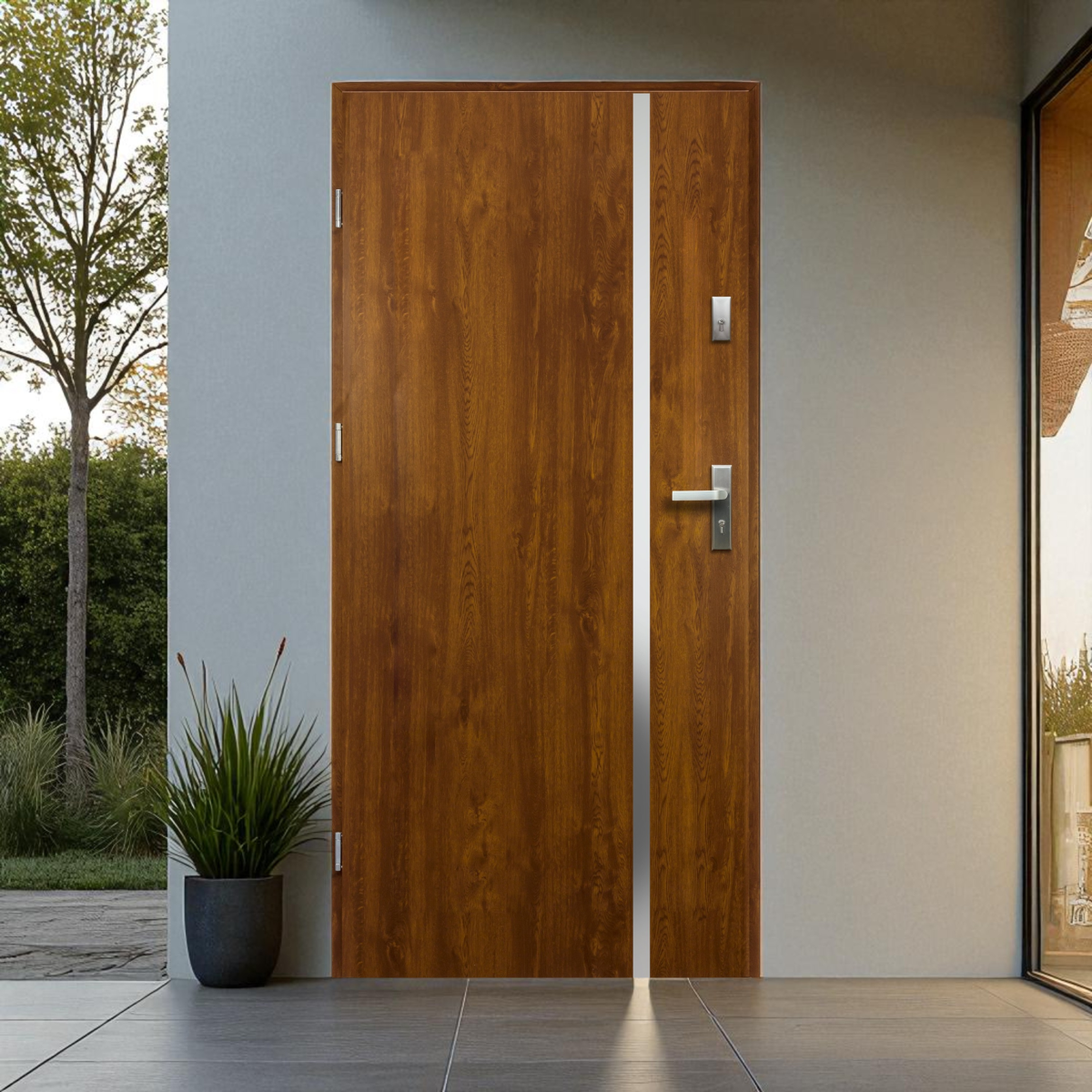 A Hebe kültéri bejárati ajtó arany tölgy színben, meleg, mégis modern megjelenéssel kínál elegáns megoldást családi házakhoz és társasházakhoz.