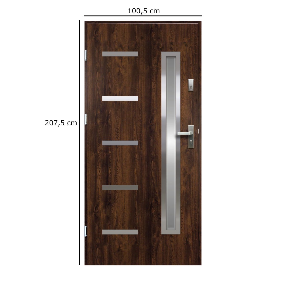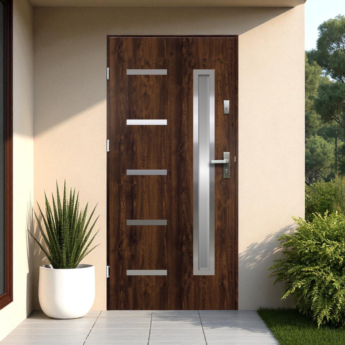 A Juventus acél kültéri bejárati ajtó a megbízhatóságot és a modern megjelenést ötvözi. Sötét dió színű felületével elegáns, természetes hatást kelt, amely jól illeszkedik klasszikus és modern homlokzatokhoz egyaránt.