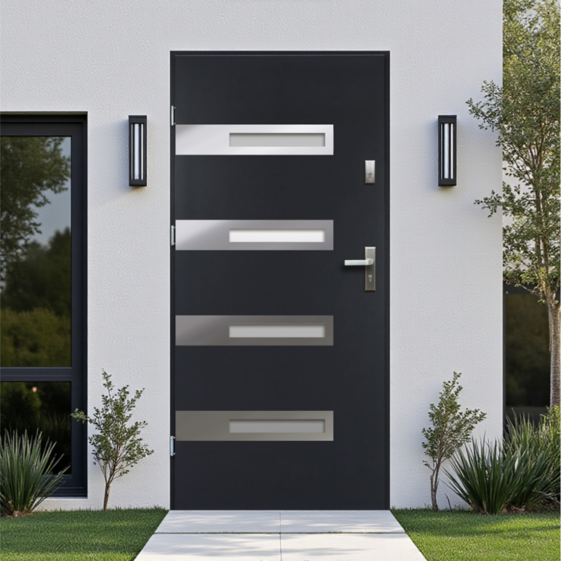 A homokfúvott üvegbetétek modern stílust adnak, miközben fényt engednek a belső térbe. Az 55 mm vastag ajtószárny préselt acéllemezből készült, amelyhez expandált polisztirol szigetelés társul a jobb hő- és hangszigetelés érdekében.