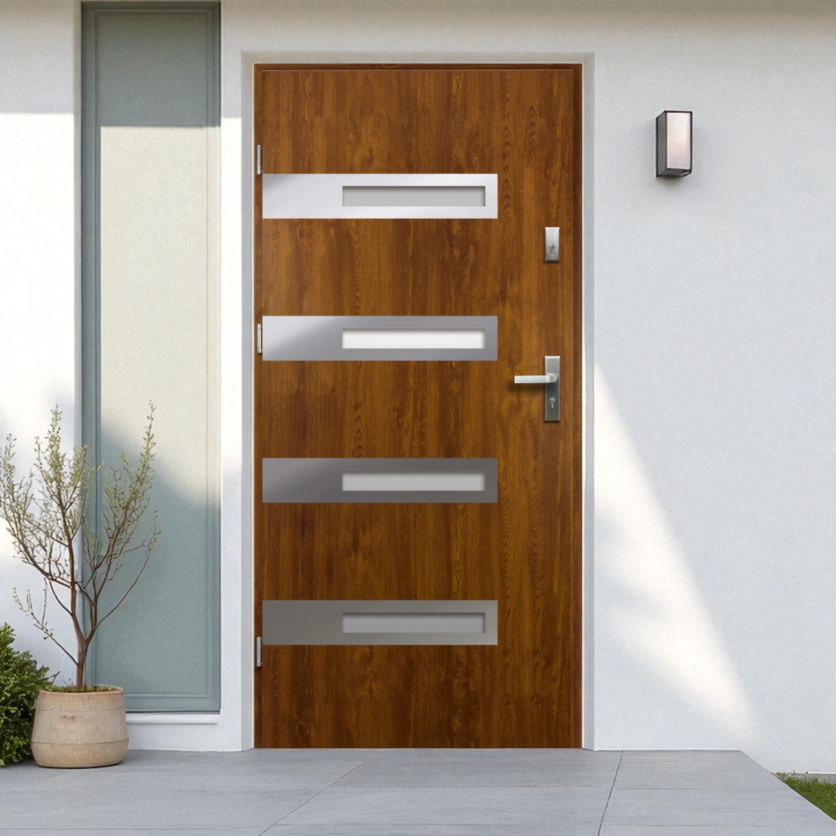 A Rea kültéri bejárati ajtó arany tölgy színben elegáns és meleg megjelenést kölcsönöz otthonodnak.