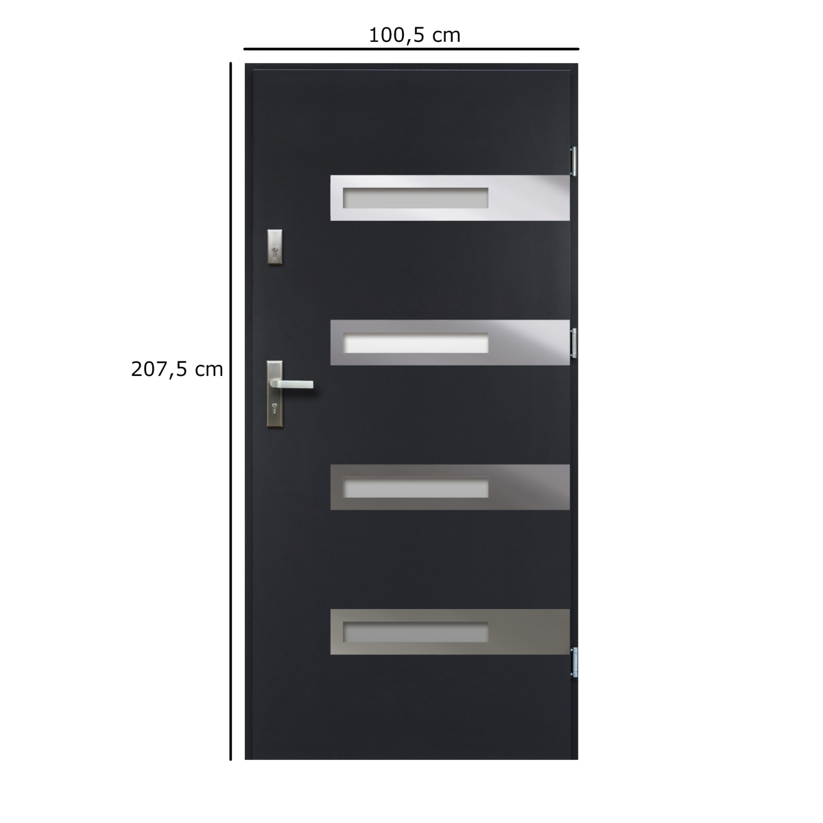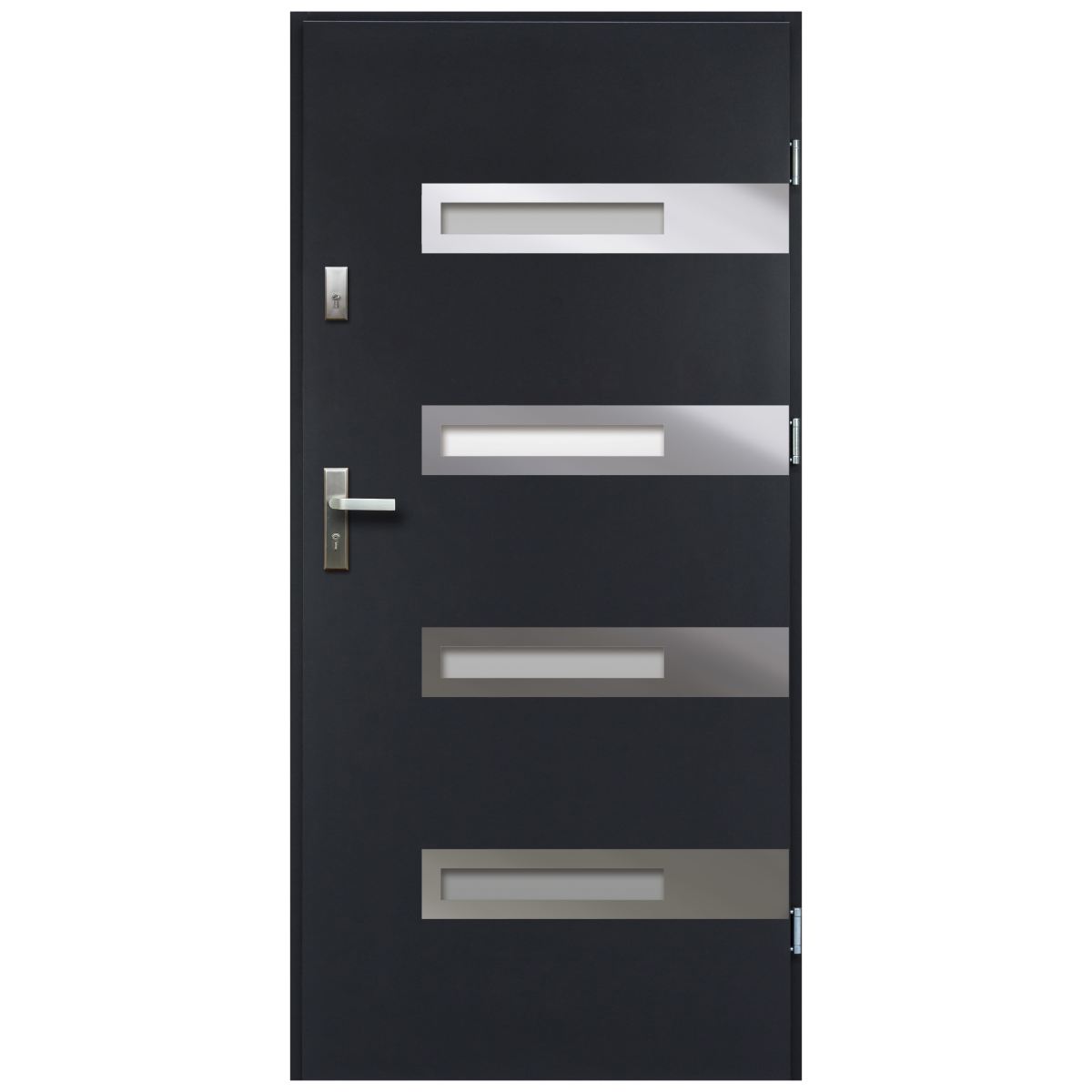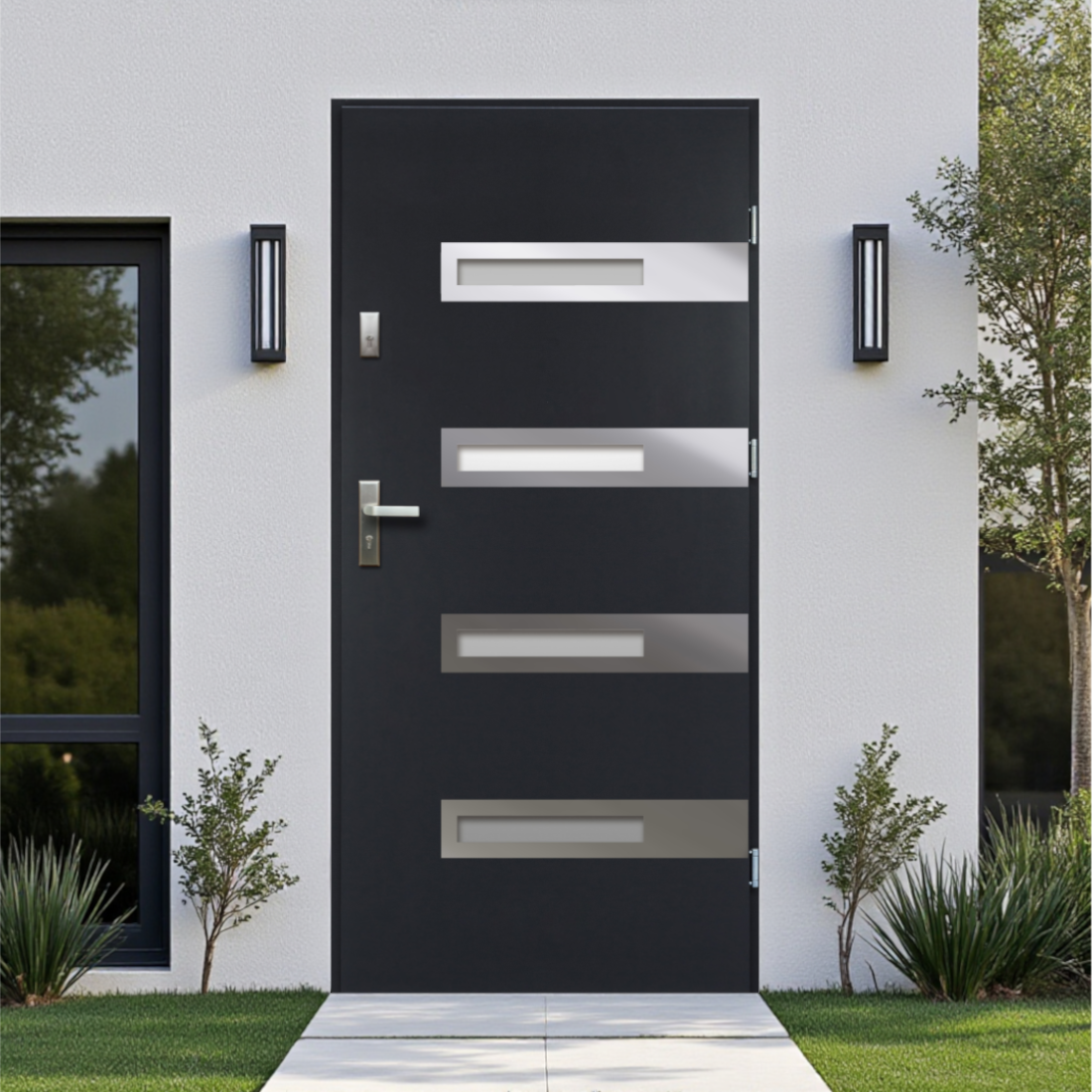 A homokfúvott üvegbetétek modern stílust adnak, miközben fényt engednek a belső térbe. Az 55 mm vastag ajtószárny préselt acéllemezből készült, amelyhez expandált polisztirol szigetelés társul a jobb hő- és hangszigetelés érdekében.