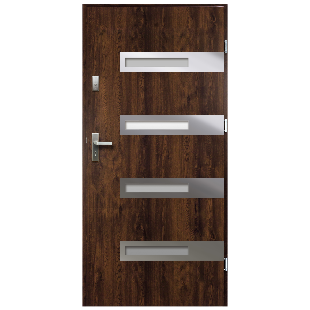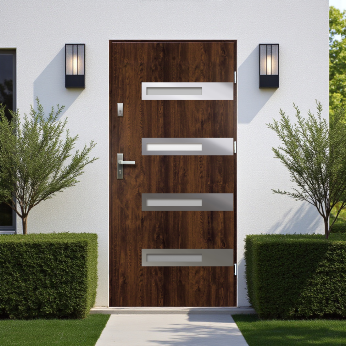A Rea kültéri bejárati ajtó sötét dió színben elegáns és meleg megjelenést kölcsönöz otthonodnak.