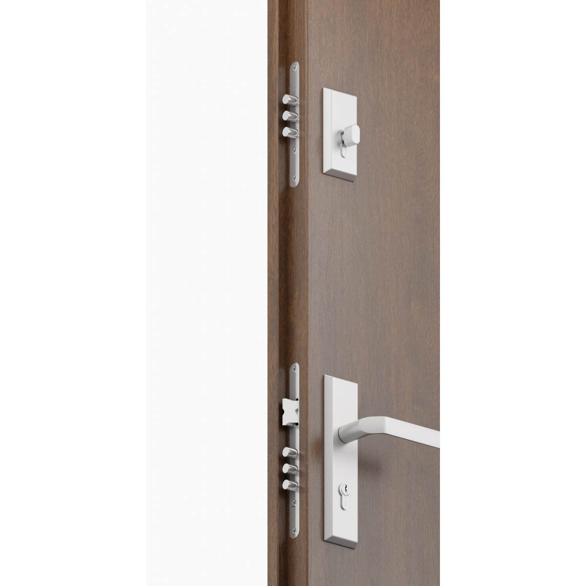 Az ajtó 2 független zárszerkezettel és 3 állítható zsanérral van felszerelve, így biztonságosabb és stabilabb működést nyújt. A keretben és a küszöbnél elhelyezett tömítések biztosítják a jobb záródást, míg az UV-álló PVC dekorfólia hosszabb ideig megőrzi az ajtó esztétikus sötét dió színét.